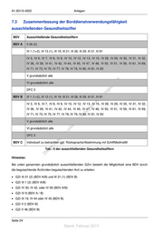A1-831/0-4002 Anlagen 7.3 Zusammenfassung der Borddienstverwendungsfähigkeit ausschließenden Gesundheitsziffer BDV Ausschließende Gesundheitsziffern BDV A II 26 (2) III 1 (1+2), III 13 (1), III 19, III 21, III 26, III 29, III 31, III 81 IV 3, IV 6, IV 7, IV 8, IV 9, IV 10, IV 12, IV 13, IV 15, IV 28, IV 29, IV 30, IV 31, IV 32, IV 36, IV 39, IV 41, IV 42, IV 44, IV 45, IV 47, IV 48, IV 50, IV 51, IV 59, IV 61, IV 69, IV 71, IV 73, IV 75, IV 77, IV 78, IV 79, IV 80, IV 81, IV 83 V grundsätzlich alle st ! VI grundsätzlich alle en sd i DFC 3 ng ru BDV B III 1 (1+2), III 13 (1), III 19, III 21, III 26, III 29, III 31, III 81 de Än IV 3, IV 6, IV 7, IV 8, IV 9, IV 10, IV 12, IV 13, IV 15, IV 28, IV 29, IV 30, IV 31, IV 32, m de IV 36, IV 39, IV 41, IV 42, IV 44, IV 45, IV 47, IV 48, IV 50, IV 51, IV 59, IV 61, IV 69, ht IV 71, IV 73, IV 75, IV 77, IV 78, IV 79, IV 80, IV 81, IV 83 ic tn V grundsätzlich alle eg rli te VI grundsätzlich alle un k DFC 3 uc dr BDV C us Individuell zu betrachten ggf. Rücksprache/Abstimmung mit SchiffMedInstM rA se Tab.: 6 der ausschließenden Gesundheitsziffern ie D Hinweise: Bei unten genannten grundsätzlich ausschließenden GZrn besteht die Möglichkeit eine BDV durch die begutachtende Ärztin/den begutachtenden Arzt zu erteilen: • GZr III 31 (2) (BDV A/B) und III 31 (1) (BDV B) • GZr III 1 (2) (BDV A/B) • GZr IV 30, IV 42, oder IV 59 (BDV A/B) • GZr IV 9 (BDV A / B) • GZr III 19, IV 44 oder IV 45 (BDV B) • GZr V 2 (BDV B) • GZr V 46 (BDV B) Seite 24 Stand: Februar 2017