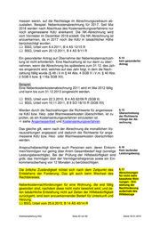 messen waren, auf die Rechtslage im Abrechnungszeitraum ab- zustellen. Beispiel: Nebenkostenabrechnung für 2017. Seit Mai 2018 werden nach Abschluss des Kostensenkungsverfahrens nur noch angemessene KdU anerkannt. Die NK-Abrechnung wird vom Vermieter im Dezember 2018 erstellt. Die NK-Abrechnung ist anzuerkennen, da in 2017 noch die KdU in tatsächlicher Höhe berücksichtigt wurden. BSG, Urteil vom 6.4.2011, B 4 AS 12/10 R BSG, Urteil vom 20.12.2011, B 4 AS 9/11 R Ein gesonderter Antrag auf Übernahme der Nebenkostennachzah- 6.14 lung ist nicht erforderlich. Eine Nachzahlung ist nur dann zu über- kein gesonderter Antrag nehmen, wenn die Abrechnung bis spätestens zum 31.12. des Jah- res eingereicht wird, welches auf das Jahr folgt, in dem die Nach- zahlung fällig wurde (§ 48 i.V.m § 44 Abs. 4 SGB X i.V.m. § 40 Abs. 2 SGB II bzw. § 116a SGB XII). Beispiel: Eine Nebenkostenkostenabrechnung 2011 wird im Mai 2012 fällig und kann bis zum 31.12.2013 eingereicht werden. BSG, Urteil vom 22.3.2010, B 4 AS 62/09 R (SGB II) BSG, Urteil vom 10.11.2011, B 8 SO 18/10 R (SGB XII) Werden durch die Nachzahlungen die Richtwerte für angemesse- 6.15 ne KdU bzw. Heiz- oder Warmwasserkosten überschritten, ist zu Überschreitung der Richtwerte prüfen, ob ein Kostensenkungsverfahren einzuleiten ist. infolge der Ab- siehe Angemessenheit und Kostensenkungsverfahren rechnung Das gleiche gilt, wenn nach der Abrechnung die monatlichen Vo- rauszahlungen angepasst und dadurch die Richtwerte für ange- messene KdU bzw. Heiz- oder Warmwasserkosten überschritten werden. Anspruchsberechtigt können auch Personen sein, deren Einkom- 6.16 men/Vermögen nur gering über ihrem Gesamtbedarf liegt (sonstige Kein laufender Leistungsbezug Leistungsberechtigte). Bei der Prüfung der Hilfsbedürftigkeit sind grds. das Vermögen über der Vermögensfreigrenze sowie ein Ein- kommensüberhang von 12 Monaten zu berücksichtigen. Die örtliche Zuständigkeit richtet sich nach dem Zeitpunkt des 6.17 Entstehens der Forderung. Das gilt auch beim Wechsel des Abrechnungen für nicht mehr Rechtskreises. bewohnte Woh- nungen - Ent- Nebenkostennachforderungen für eine Wohnung, die erst fällig stehung der geworden sind, nachdem diese nicht mehr bewohnt wird, und de- Nachforderung ren tatsächliche Entstehung nicht auf Zeiten der Hilfebedürftigkeit außerhalb des Hilfebezugs zurückgeht, sind kein anzuerkennender Bedarf für Unterkunft und Heizung. BSG, Urteil vom 25.6.2015, B 14 AS 40/14 R Arbeitsempfehlung KdU Seite 45 von 92 Stand: 02.01.2019