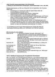 [DAS]: Deutsche Anpassungsstrategie an den Klimawandel 1. Sitzung der Interministeriellen Arbeitsgruppe „Anpassungsstrategie" vom 4. Mai 2009 Beteiligungsprozesses zur DAS aus. Eckpunkte für die Organisation des Prozesses sollten sein: = .die Beteiligung von Kommunen sollte als eigene Säule neben der Länderbeteiligung entwickelt werden, = ressortspezifische Fragestellungen werden in klassischen Abstimmungsprozessen (wie Anhörungen) diskutiert, = nicht-ressortspezifische, querschnittsbezogene Fragestellungen und Themen sollten in offenen Gruppen diskutiert werden, hierbei sind die Erfahrungen des Rates für Nachhaltige Entwicklung zu nutzen, = das Internet soll als Medium genutzt werden, um Rückkopplungen einer breiten Öffentlichkeit zur DAS und zu einem ersten Entwurf des Aktionsplans zu erhalten. Bei Konsultationen per Internet sollen spezifische Fragen gestellt werden, um klare und verwertbare Rückmeldungen zu erhalten. In der Etablierung eines neuen Beratungsgremiums (analog des Rates für. Nachhaltige Entwicklung (RNE)) wird mehrheitlich kein Mehrwert gesehen. BMU-Vorschlag für einen Zeitplan: Ende Juni 09: 2. IMA-Sitzung finalisiert Konzepte „Aktionsplan“ und „Beteiligungsprozess“ [Anmerkung bei Protokollerstellung: 2. IMA Sitzung wurde verschoben und findet voraussichtlich im September 2009 statt] Parallel: Weiterführung des Bund-Länder-Austausches ggf. im Rahmen des neu einzurichtenden Ständigen Ausschusses „Anpassung“ der BLAK KliNa der UMK. November 09: DAS - erste gemeinsame IMA-Veranstaltung zu „Dialog und Beteiligung“ (vorgesehen) Bis Frühherbst 10: Entwurf Aktionsplan und Treffen der IMA auf AbtL-Ebene Ab Herbst 10: Abstimmung mit Bundesländern Danach: .. erneute Beteiligungsrunde sonstiger Betroffener Frühjahr 2011: Überarbeitung Aktionsplan Ende Februar 2011: Einleitung Abstimmung der Kabinettvorlage zum Aktionsplan Ende April 2011: Kabinettbefassung TOP 5: Weißbuch Anpassung der Europäischen Kommission BMU wird gebeten, die ressortabgestimmte ‚Weisung zu den Ratschlussfolgerungen (Umweltrat) aktiv vorzutragen. BMELV bittet auch zukünftig darauf zu achten, dass das Subsidiaritätsprinzip eingehalten wird und zusätzliche Richtlinien vermieden werden. BMU wird in Bezug auf europäische Aktivitäten in der Folge des Weißbuches zur Erarbeitung einer europäischen Anpassungsstrategie eine bündelnde Rolle für Deutschland einnehmen, da nicht alle Ressorts über die entsprechenden Generaldirektionen der EU-Kommission in den Anpassungsprozess einbezogen werden. Aufgabe des BMU wird daher sein, Informationen rund um EU- Anpassungsaktivitäten in die IMA einzubringen. Die Ressorts werden daher gebeten, BMU zu informieren, wo bilaterale Anpassungsgremien zwischen Mitgliedstaaten und der Kommission bestehen (etwa in der Landwirtschaft und für Migration) und welche 3