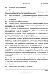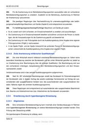 A2-221/0-0-2150 Berechtigungen 264. Für die Zuerkennung ist ein Betriebsberechtigungsschein auszustellen oder ein vorhandener Betriebsberechtigungsschein zu erweitern. Zusätzlich ist die Bemerkung „Zuerkennung im Rahmen der Anerkennung“ aufzunehmen. 265. Die jeweiligen Regelungen über Nachweisführung für unterweisungspflichtige oder befähi- gungsnachweispflichtige Maschinen und Geräte (Kapitel 6) sind entsprechend anzuwenden. 266. Für befähigungsnachw eispflichtige Maschinen und Geräte gilt zudem: • Es ist, soweit noch nicht vorhanden, ein Einsatznachweisheft zu erstellen und auszuhändigen. • Die Zuerkennung ist im Einsatznachweisheft detailliert aufzuführen und durch die Person zu bestä- tigen, die die Voraussetzungen für die Zuerkennung geprüft und bewertet hat. • Die Zuerkennung ist in der Prüfungsliste durch die Ausbildungsleitung (ohne Angabe einer eigenen Prüfungsnummer (PrfgNr.)) nachzuweisen. st en • In der Spalte PrfgNr. und der Spalte Unterschrift der prüfenden Person im Betriebsberechtigungs- sd i ng schein unterschreibt die Ausbildungsleitung ohne Angabe einer eigenen PrfgNr. ru de 2.2.4.5 Zivile Anerkennung militärischer Qualifikationen Än 267. m Die zivile Wirtschaft erkennt militärisch erworbene Betriebsberechtigungen an. Sofern keine de ht besondere Vereinbarung zwischen der Bundeswehr und der zivilen Wirtschaft getroffen ist, bedarf es ic tn zur Anerkennung einer Bescheinigung über die erlangte Qualifikation. Die Bescheinigung wird aus eg den vorhandenen Unterlagen, beispielsweise dem Betriebsberechtigungsschein und dem Einsatz- rli nachweisheft, erstellt. te un k Verfahrenshinweise sind in das zentrale Ausbildungsprogramm aufgenommen. uc dr 268. us Nach Nr. 267 erforderliche Bescheinigungen erstellt das Bundesamt für Personalmanagement rA der Bundeswehr oder in dessen Auftrag das jeweils zuständige Karrierecenter auf Antrag der aus- se ie scheidenden oder ausgeschiedenen Soldatin bzw. des ausscheidenden oder ausgeschiedenen Sol- D daten. Näheres regeln die zentralen Ausbildungsprogramme. 269. Diese Regelungen sind entsprechend auf ausscheidende oder ausgeschiedene Beamtinnen bzw. Beamte und Arbeitnehmerinnen bzw. Arbeitnehmer der Bundeswehr anzuwenden. 2.2.5 Erweiterung durch typenbezogene Einweisung 2.2.5.1 Allgemeines 270. Eine vorhandene Betriebsberechtigung kann innerhalb einer Geräteuntergruppe im Rahmen einer t ypenbezogenen Einw eisung um weitere Betriebsberechtigungen erweitert werden. Eine Prüfung oder Überprüfung entfällt. Die typenbezogene Einweisung ist zulässig, wenn Seite 32 Stand: Oktober 2016