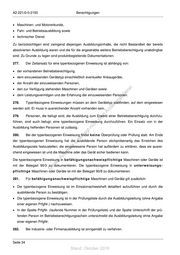 A2-221/0-0-2150 Berechtigungen • Maschinen- und Motorenkunde, • Fahr- und Betriebsausbildung sowie • technischer Dienst. Zu berücksichtigen sind zwingend diejenigen Ausbildungsinhalte, die nicht Bestandteil der bereits absolvierten Ausbildung waren und die für die angestrebte weitere Betriebsberechtigung unabdingbar sind. Zu Grunde zu legen sind produktbegleitende Dokumentationen. 277. Der Zeitansatz für eine typenbezogenen Einweisung ist abhängig von: • der vorhandenen Betriebsberechtigung, • dem einzuweisenden Gerätetyp einschließlich eventueller Anbaugeräte, • der Anzahl der einzuweisenden Personen, • den zur Verfügung stehenden Maschinen und Geräten sowie st en • dem Leistungsvermögen und der Erfahrung der einzuweisenden Personen. sd i ng 278. Typenbezogene Einweisungen müssen an dem Gerätetyp stattfinden, auf dem eingewiesen ru werden soll. Er muss in ausreichender Anzahl vorhanden sein. de Än 279. m Personen, die befugt sind, die Ausbildung zum Erwerb einer Betriebsberechtigung durchzu- de führen, sind auch befugt, eine typenbezogene Einweisung durchzuführen. Ein Einsatz von in der ht Ausbildung helfenden Personen ist zulässig. ic tn eg 280. Bei der typenbezogenen Einweisung findet keine Überprüfung oder Prüfung statt. Am Ende rli te der typenbezogenen Einweisung hat die ausbildende Person stichprobenartig das Erreichen des un k Ausbildungsziels festzustellen; die eingewiesene Person hat außerdem zu erklären, dass sie ausrei- uc dr chend eingewiesen ist und die Maschine oder das Gerät sicher bedienen kann. us rA Die typenbezogene Einweisung in befähigungsnachw eispflichtige Maschinen oder Geräte ist se mit der Belegart 90/3 zu dokumentieren. Die typenbezogene Einweisung in unterw eisungs- ie D pflichtige Maschinen oder Geräte ist mit der Belegart 90/8 zu dokumentieren. 281. Für befähigungsnachw eispflichtige Maschinen und Geräte gilt zusätzlich: • Die typenbezogene Einweisung ist im Einsatznachweisheft detailliert aufzuführen und durch die ausbildende Person zu bestätigen. • Die typenbezogene Einweisung ist in der Prüfungsliste durch die Ausbildungsleitung (ohne Angabe einer eigenen PrfgNr.) nachzuweisen. • In der Spalte PrfgNr. (laufende Nummer in der Prüfungsliste) und der Spalte Unterschrift der prü- fenden Person im Betriebsberechtigungsschein unterschreibt die Ausbildungsleitung ohne Angabe einer eigenen PrfgNr. 282. Bei Industrie- oder Firmenausbildung ist sinngemäß zu verfahren. Seite 34 Stand: Oktober 2016
