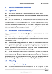 Behandlung von Berechtigungen A2-221/0-0-2150 3 Behandlung von Berechtigungen 3.1 Allgemeines 301. Der Erwerb von Berechtigungen ist der personalbearbeitenden Stelle zu melden. 302. Der Betriebsberechtigungsschein ist beim Fahren und Bedienen der Maschinen und Geräte mitzuführen. 303. Fahr- und Bedienpersonal von fahrerlaubnispflichtigen Maschinen und Geräten ist darauf hinzuweisen, dass alle amtlichen Maßnahmen, die eine Einschränkung oder den Verlust der allge- meinen Fahrerlaubnis zum Gegenstand haben (Fahrverbot, Sicherstellung, Beschlagnahme, Entzug), unverzüglich der Dienststellenleitung zu melden sind. Durch diese ist sicherzustellen, dass von davon st berührten Betriebsberechtigungsscheinen nur Gebrauch gemacht wird, solange das Fahr- und Be- en dienpersonal im Besitz der allgemeinen Fahrerlaubnis ist. sd i ng ru 3.2 Geltungsdauer und Gültigkeitsbereiche de Än 304. Die Betriebs-, Lehr- und Prüfberechtigungen gelten für die Dauer des Dienst- oder Arbeits- m verhältnisses. de ht 305. ic Für Angehörige anderer Streitkräfte, die an Maschinen und Geräten der Bundeswehr ausge- tn eg bildet werden, gelten die hier verankerten Regelungen. Erworbene Berechtigungsscheine verbleiben rli im Besitz dieser Personen. te un 306. Soldatinnen bzw. Soldaten, Beamtinnen bzw. Beamte und Arbeitnehmerinnen bzw. Arbeit- uc k dr nehmer der Bundeswehr, die im Ausland eingesetzt sind und die entsprechende Betriebsberechti- us gung der Bundeswehr besitzen, dürfen auch dort Maschinen und Geräte der Bundeswehr fahren und rA se bedienen. Beim Fahren außerhalb umschlossener militärischer Anlagen sind abweichende oder ie D zusätzliche Bestimmungen des Aufnahmestaats zu berücksichtigen. 307. Für Fahr- und Bedienpersonal von Maschinen und Geräten, welches bei Dienststellen der Bundeswehr im Ausland tätig ist und nicht die deutsche Staatsangehörigkeit besitzt, gelten für das Fahren und Bedienen der Maschinen und Geräte der Bundeswehr zusätzlich die Vorgaben über Betriebsberechtigungen des Aufnahmestaats. Stimmen diese nicht mit den nationalen Festlegungen überein, sind die strengeren Bestimmungen anzuwenden. Im Zweifel gilt deutsches Recht. 3.3 Behandlung 3.3.1 Ausstellung und Aushändigung 308. Die Ausbildungsstelle bereitet den Berechtigungsschein vor. Die Eintragungen sind doku- mentenecht, Eintragungen von Hand lesbar in Druckschrift vorzunehmen. Es sind Geräteuntergruppe Seite 35 Stand: Oktober 2016