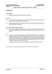 Freie und Hansestadt Hamburg allgemeinbildende Behörde für Schule und Berufsbildung gymnasiale Oberstufen Abitur2012 Kernfach Englisch auf erhöhtem Anforderungsniveau, Aufgabe II Assignments Comprehension l Outline the traditional role ofthe London district ofBrixton. Analysis 2.1 Analyse the author's attitude towards recent changes that have taken place in Brixton, and the means he uses to convince bis readers ofhis views. 2.2 Compare the changes that have taken place in Brixton with changes that London in general or another metropolis has undergone. Comment / Creative Writing (Choose one.) 3.1 Discuss the advantages and disadvantages of the changes taking place in Brixton for the district and its inhabitants, in light of the fact that the author has feit forced to move out of Brixton. or 3.2 Imagine you are the West Indian manager ofthe Starbucks coffee shop the author mentions at the end of his article. Your Starbucks branch is quite successful, you have just received a moderate pay-rise and this is the first managerial Job you have been able to hold down for more than a year. Besides, you and your girlfriend live in a one-bedroom flat above the coffee- shop and you were able to shake Prince Charles' hand during bis latest visit. You have read Philip Dayle's article on Brixton in The Guardian. Write a letter to the editor of The Guardian in which you respond to Philip Dayle's article. Die vier Teilaufgaben haben gleiches Gewicht; sie gehen mit jeweils 25% in die Bewertung des Inhalts em. Engl-KFeA-A Seite 8 von 8