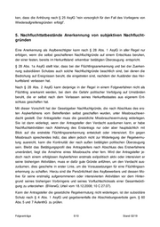 ken, dass die Anhörung nach § 25 AsylG ”rein vorsorglich für den Fall des Vorliegens von Wiederaufgreifensgründen erfolgt”. 5. Nachfluchttatbestände Anerkennung von subjektiven Nachflucht- gründen Eine Anerkennung als Asylberechtigter kann nach § 28 Abs. 1 AsylG in aller Regel nur erfolgen, wenn die selbst geschaffenen Nachfluchtgründe auf einem Entschluss beruhen, der einer festen, bereits im Herkunftsland erkennbar betätigten Überzeugung entspricht. § 28 Abs. 1a AsylG stellt klar, dass bei der Flüchtlingsanerkennung und bei der Zuerken- nung subsidiären Schutzes auch solche Nachfluchtgründe beachtlich sind, bei denen die Bedrohung auf Ereignissen beruht, die eingetreten sind, nachdem der Ausländer das Her- kunftsland verlassen hat. Nach § 28 Abs. 2 AsylG kann derjenige in der Regel in einem Folgeverfahren nicht als Flüchtling anerkannt werden, bei dem die Gefahr politischer Verfolgung auf Umständen beruht, die er selbst nach dem Verlassen seines Herkunftsstaates aus eigenem Ent- schluss geschaffen hat. Mit dieser Vorschrift hat der Gesetzgeber Nachfluchtgründe, die nach Abschluss des ers- ten Asylverfahrens vom Betreffenden selbst geschaffen wurden, unter Missbrauchsver- dacht gestellt. Der Antragsteller muss die gesetzliche Missbrauchsvermutung widerlegen. Sie ist dann widerlegt, wenn der Antragsteller den Verdacht ausräumen kann, er habe Nachfluchtaktivitäten nach Ablehnung des Erstantrags nur oder aber hauptsächlich mit Blick auf die erstrebte Flüchtlingsanerkennung entwickelt oder intensiviert. Ein gegen Missbrauch sprechendes Indiz, das allein jedoch nicht zur Widerlegung der Regelvermu- tung ausreicht, kann die Kontinuität der nach außen betätigten politischen Überzeugung sein. Bleibt das Betätigungsprofil des Antragstellers nach Abschluss des Erstverfahrens unverändert, liegt die Annahme eines Missbrauchs eher fern. Wird der Antragsteller je- doch nach einem erfolglosen Asylverfahren erstmals exilpolitisch aktiv oder intensiviert er seine bisherigen Aktivitäten, muss er dafür gute Gründe anführen, um den Verdacht aus- zuräumen, dies geschehe in erster Linie, um die Voraussetzungen für eine Flüchtlingsan- erkennung zu schaffen. Hierzu sind die Persönlichkeit des Asylbewerbers und dessen Mo- tive für seine erstmalig aufgenommenen oder intensivierten Aktivitäten vor dem Hinter- grund seines bisherigen Vorbringens und seines Vorfluchtschicksals einer Gesamtwürdi- gung zu unterziehen (BVerwG, Urteil vom 18.12.2008; 10 C 27.07). Kann der Antragsteller die gesetzliche Regelvermutung nicht widerlegen, ist der subsidiäre Schutz nach § 4 Abs. 1 AsylG und gegebenenfalls die Abschiebungsverbote gem. § 60 Abs. 5 und 7 AufenthG zu prüfen. Folgeanträge 5/10 Stand 02/19