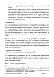 Die beim Antragsteller /Kläger auftretenden Symptome müssen konkret dargestellt werden. Begründung der Diagnose muss sich an den in einem der beiden einschlägigen D i- agnosemanuale aufgeführten Kriterien orientieren, so dass das Vorhandensein ei- nes geeigneten Auslösers der Erkrankung und der Symptom-Trias der PTBS (Wie- dererleben, Vermeidung, Übererregung) nachvollziehbar ist. Hierzu ist eine konkre- te Darstellung des in der Untersuchung eruierten Tatsachenstoffes erforderlich. Wi- dersprüche und Steigerungen im Sachvortrag, insbesondere zum traumatisieren- den Ereignis, müssen erklärt sein. Gefahrenprognose Eine Wiederholung des Maßstabs „wesentliche Gesundheitsverschlechterung“ mit glei- chen oder ähnlichen Worten oder die schlagwortartige Benennung von Gesundheitsgefah- ren (z.B. Retraumatisierungsgefahr) genügt nicht. Es ist eine konkrete, plastische Schilde- rung der gesundheitlichen Folgen erforderlich. Zur nachvollziehbaren Darlegung gehört eine Begründung der Prognose bzw. deren Herleitung aus der Erkrankung. Benannt wer- den muss die Wahrscheinlichkeit des Eintritts der Gefahr. Ebenso ist eine Begründung für die prognostizierte Eintrittswahrscheinlichkeit des beschriebenen Gefahrenszenarios not- wendig. 4.3 Vermeidbarkeit der Gefahr durch Behandlung im Zielstaat der Rückführung Es gibt noch keine ausreichenden Belege dafür, dass die erforderliche Effektivität der B e- handlungsmöglichkeit bei PTBS-Fällen grundsätzlich durch eine ausschließlich medika- mentöse Behandlung erreicht werden kann. Vielmehr liegt der Schwerpunkt der therapeu- tischen Effektivität nach noch herrschender Meinung bei folgenden psychotherapeutischen Verfahren zur Traumabearbeitung: 36 • Kognitiv-behaviorale Verfahren 37 • EMDR (Eye Movement Desensitization and Reprocessing) Im Einzelfall gilt nur dann etwas anderes, wenn der Antragsteller bisher anders behandelt wurde. Die bisherige Behandlung in Deutschland kann auch als im Herkunftsland hinrei- chend effektive Behandlung bewertet werden, sofern sich aus dem vorgetragenen Sach- verhalt nicht Gegenteiliges ergibt. Anlage 1 (Vermerk zur Kostenabrechnung) 36 Konfrontationstherapie und Angst-Management-Training: Wiederholte und lang andauernde Konfrontation mit traumarelevanten Inhalten (in der Therapie) und Erlernen wirksamer Verhaltensweisen. Aufgrund von Studien ist ihre Wirksamkeit empirisch am besten belegt. 37 Besondere Form der kognitiv-behavioralen Verfahren: Konfrontation mit traumarelevanten Inhalten und angstauslösenden Stimuli zusammen mit einer kognitiven Umbewertung. Krankheitsbedingte Abschiebungs verbote 15/16 Stand 02/19