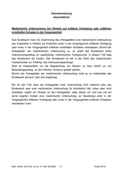 Dienstanweisung Asylverfahren Medizinische Untersuchung bei Hinweis auf erlittene Verfolgung oder erlittenen ernsthaften Schaden in der Vergangenheit Das Bundesamt kann mit Zustimmung des Antragstellers eine medizinische Untersuchung des Ausländers in Hinblick auf Anzeichen einen in der Vergangenheit erlittenen Verfolgung oder eines in der Vergangenheit erlittenen ernsthaften Schadens veranlassen. Stimmt der Antragsteller der medizinischen Untersuchung zu, so erteilt das Bundesamt einen Untersuchungsauftrag an qualifiziertes medizinisches Fachpersonal. In diesem Fall trägt das Bundesamt die Kosten. Das Bundesamt ist frei in der Wahl des medizinischen Fachpersonals zur Erfüllung des Untersuchungsauftrags. Geht es insbesondere um die Begutachtung von Narben, so kann hierfür u.a. ein Behandlungsauftrag an den örtlichen Amtsarzt gestellt werden. Stimmt der Antragsteller der medizinischen Untersuchung nicht zu, so entscheidet das Bundesamt dennoch über den Asylantrag. Nur für den Fall, dass der Antragsteller einer Untersuchung nicht zustimmt oder das Bundesamt zwar eine medizinische Untersuchung für erforderlich hält, diese aber nicht veranlasst, ergeht ein Hinweis an den Antragsteller, dass dieser von sich aus und auf seine eigenen Kosten eine medizinische Untersuchung zur Beurteilung einer in der Vergangenheit erlittenen Verfolgung oder eines in der Vergangenheit erlittenen Schadens veranlassen kann. Med. Unt ers. bei Hinw. auf erl. Vf. oder Schaden 1/1 Stand 03/16