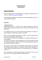 Dienstanweisung Asylverfahren Mehrfachidentitäten Hinweis: Die Bearbeitung von Mehrfachverfahren und verdeckten Folgeanträgen hat mit Priorität zu erfolgen (vgl. DA-Asyl zu "Prioritäten"). Eine ausführliche Beschreibung der Bearbeitung von Mehrfachidentitäten finden Sie im „Leitfaden Mehrfachidentitäten“. Definitionen 1. Mehrfachverfahren Mehrfachverfahren liegen vor, wenn eine Person mehrere Asylverfahren zumindest pha- senweise zeitgleich betreibt oder betrieben hat. Es handelt sich dabei letztlich nur um ein Asylverfahren. Das Asylverfahren wird durch den zeitlich frühesten Antrag eingeleitet. Die weiteren An- träge sind lediglich als ergänzendes Vorbringen zu betrachten. Durch die erste unanfechtbare Entscheidung im Verfahren - gleich unter welchem Akten- zeichen - wird das Verfahren insgesamt beendet. Eine Erklärung der Rücknahme des Asylantrages für ein Aktenzeichen beendet das Ver- fahren insgesamt. Auch wenn das Verfahren mit allen Verfahrensteilen durch die zeitlich früheste unanfecht- bare Entscheidung insgesamt beendet wird, bleiben die Abschiebungsandrohungen aller Verfahrensteile grundsätzlich vollziehbar. Jeder weitere nach dem Zeitpunkt der unanfechtbaren Entscheidung oder der Rücknahme des Asylantrags gestellte Antrag ist ein Folgeantrag. Werden mehrere Folgeanträge zu- mindest phasenweise zeitgleich betrieben, liegt ein Mehrfachverfahren im Folgeantrags- verfahren vor. Eine Treffermeldung (z. B. INPOL-E-Gruppen-Ausdruck, Mitteilung des LKA oder einer ABH) zu einer Vor- oder Hilfsakte stellt keinen Mehrfachantrag dar. Mehrfachidentitäten 1/7 Stand 04/15