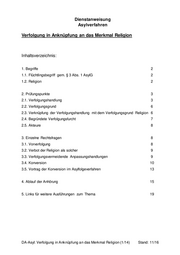 Dienstanweisung Asylverfahren Verfolgung in Anknüpfung an das Merkmal Religion Inhaltsverzeichnis: 1. Begriffe 2 1.1. Flüchtlingsbegriff gem. § 3 Abs. 1 AsylG 2 1.2. Religion 2 2. Prüfungspunkte 3 2.1. Verfolgungshandlung 3 2.2. Verfolgungsgrund 6 2.3. Verknüpfung der Verfolgungshandlung mit dem Verfolgungsgrund Religion 6 2.4. Begründete Verfolgungsfurcht 7 2.5. Akteure 8 3. Einzelne Rechtsfragen 8 3.1. Vorverfolgung 8 3.2. Verbot der Religion als solcher 9 3.3. Verfolgungsvermeidende Anpassungshandlungen 9 3.4. Konversion 10 3.5. Vortrag der Konversion im Asylfolgeverfahren 13 4. Ablauf der Anhörung 15 5. Links für weitere Ausführungen zum Thema 19 DA-Asyl: Verfolgung in Anknüpfung an das Merkmal Religion (1/14) Stand: 11/16