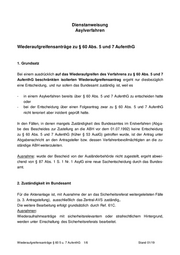 Kann das Ergebnis der Prüfung unverzüglich (innerhalb einer Woche) mit einem Bescheid umgesetzt und zugestellt werden, kann eine gesonderte Mitteilung nach § 71 Abs. 5 AsylG ausnahmsweise ersatzlos entfallen. Insbesondere ist diese Mitteilung nicht mehr mit oder gar nach dem Bescheid zu veranlassen. 6. Entscheidung Das Wiederaufgreifen des Verfahrens zu § 60 Abs. 5 und 7 AufenthG (in Zusammen- hang mit einem Folgeantrag wie auch isoliert) kann nur beansprucht werden, wenn die Voraussetzungen nach § 51 Abs. 1 bis 3 VwVfG vorliegen. Ausnahmsweise kann das Wiederaufgreifen eines solchen Verfahrens auch gem. §§ 48, 49 VwVfG von Amts wegen erfolgen. Das Ermessen obliegt hierbei nicht dem einzelnen Entscheider: Die DA-Asyl ”Wiederaufgreifen von Amts wegen im weiteren Sinne zu § 60 Abs. 5 und 7 AufenthG” ist zu beachten. Tenorierungen Die im TH / AT für Folgeanträge und Wiederaufgreifensanträge vorgegebenen Tenori e- rungen sind wie auch die anderen Tenorierungen verbindlich. Begründung Auf die im TH / AT (Themengruppe „Folge- und Wiederaufgreifensverfahren“; THFW) be- reitgestellten Gerüstbescheide und Textbausteine wird verwiesen. Ein auf die Feststellung eines Abschiebungshindernisses nach § 60 Abs. 7 Satz 1 Auf- enthG abzielender Wiederaufgreifensantrag ist auch zu prüfen, wenn im Erstverfahren bereits eine positive Feststellung zu § 60 Abs. 7 Satz 1 AufenthG betroffen wurde, dies jedoch auf einem anderen Grund beruht (z.B. eine andere, noch andauernde Erkrankung). Das Bundesamt muss alle Feststellungen treffen, die von der Ausländerbehörde bei ihrer Ermessensentscheidung hinsichtlich einer Aufenthaltsbeendigung zu berücksichtigen sind. Wurde hingegen im Erstverfahren ein Abschiebungshindernis nach § 60 Abs. 5 AufenthG festgestellt, ist ein auf § 60 Abs. 7 Satz 1 AufenthG abzielender Wiederaufgreifensantrag bereits mit der Begründung abzulehnen, dass mit diesem keine günstigere Rechtsposition gegenüber dem Erstverfahren zu erlangen sei. Wiederaufgreifensanträge § 60 5 u. 7 AufenthG 4/6 Stand 01/19