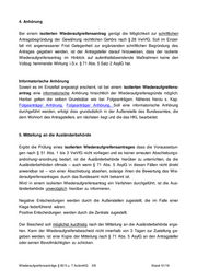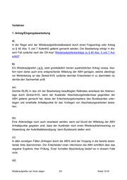 Verfahren 1. Antrag/Eingangsbearbeitung a) In der Regel wird der Wiederaufgreifenstatbestand durch einen Folgeantrag oder Antrag zu § 60 Abs. 5 und 7 AufenthG geltend gemacht werden. Die Bearbeitung erfolgt in die- sem Fall zunächst nach der DA-Asyl ”Wiederaufgreifensanträge zu § 60 Abs. 5 und 7 Auf- enthG”. b) Ein Wiederaufgreifen i.w.S. setzt grundsätzlich keinen ausdrücklichen Antrag voraus. Inso- fern kann daher auch eine entsprechende Mitteilung der ABH genügen, welche allerdings vor Weiterleitung an das Zentral-AVS zunächst dem/der Entscheider/-in zu übermitteln ist, der/die den Sachverhalt prüft. aa) Der/die RL/RL‘in des mit der Bearbeitung beauftragten Referates veranlasst die Aktenan- lage durch Zentral-AVS, wenn der Ausländer Abschiebungshindernisse gegenüber der ABH geltend gemacht hat, diese der Entscheidungskompetenz des Bundesamtes unter- liegen und ernsthafte Anhaltspunkte für das Vorliegen von Abschiebungsverboten beste- hen. bb) Eine Aktenanlage kann auch veranlasst werden, wenn auf Grund der Mitteilung der ABH Anhaltspunkte gegeben sind, dass der Ausländer noch einen Wiederaufnahmeantrag zur Abwendung der Aufenthaltsbeendigung beim Bundesamt stellen wird. cc) In allen sonstigen Fällen (Anfragen durch die ABH) wird der Vorgang in die bereits beste- hende Akte übernommen. Die Entscheider/-innen informieren die ABH schriftlich über das negative Ergebnis ihrer Prüfung. Einer formellen Bescheidung bedarf es in di esem Falle nicht. dd) Wiederaufgreifen von Amts wegen 2/3 Stand 12/18