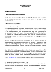 Dienstanweisung Asylverfahren Auskunftserteilung 1. Auskünfte zur Arbeit des Bundesamtes Für die Erteilung allgemeiner Auskünfte zur Arbeit des Bundesamtes sind grundsätzlich nur das Büro des Präsidenten und - in Abstimmung mit diesem - die Abt.-, Grp.- und Refe- ratsleiter zuständig. 2. Auskünfte zum Asylverfahren 2.1 Gegenüber externen Personen Für Asylbewerber besteht die Möglichkeit, externen Personen Einblick in ihr Asylverfahren zu gewähren (§ 14 Abs. 1 VwVfG), ohne dass eine umfassende Verfahrensvollmacht (wie z.B. die Vertretungsvollmacht eines Rechtsanwalts) erteilt wird. Diese Teilvollmacht kann nur natürlichen Personen erteilt werden. Sie umfasst nur das Recht zur Akteneinsicht und zur Einholung von Auskünften zum Asylverfahren, nicht jedoch die Vornahme von Verfah- renshandlungen, Abgabe von verbindlichen Erklärungen oder die Empfangsberechtigung für Bescheide. Um eine einheitliche Verfahrensweise sicherzustellen, ist der anliegende Vordruck vor Auskunftserteilung dem Anfragenden mit der Bitte um Rückgabe ( zusammen mit einer Kopie der Aufenthaltsgestattung oder eines sonstigen Identitätsnachweises des Asylbewerbers) zur Verfügung zu stellen, sofern er noch keine Teilvollmacht vorweisen kann. Nach Rücklauf der vollständig ausgefüllten und vom Asylbewerber unterschriebenen Tei l- vollmacht kann die gewünschte Auskunft erteilt werden. Sie ist in die MARiS-Akte einzu- scannen. Es darf aber auf keinen Fall eine Vertretung in der Maske „Vertreter“ erfasst werden, weil dies die Zustellung an nicht empfangsberechtigte Personen zur Folge hätte. Anlage: Teilvollmacht.pdf (bitte unausgefüllt per E-Mail oder ausgedruckt versenden) 2.2 Auskunftserteilung nach Art. 19 Abs. 1 VRL Gemäß Art. 19 Abs. 1 VRL haben die Mitgliedstaaten in den erstinstanzlichen be- hördlichen Verfahren zu gewährleisten, dass den Antragstellern auf Antrag unentgeltlich Auskunftsert eilung 1/2 Stand 07/15