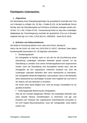 1/5 Flüchtigsein / Untertauchen 1. Allgemeines Die Überstellung eines Drittstaatsangehörigen hat grundsätzlich innerhalb einer Frist von 6 Monaten zu erfolgen (Art. 29 Abs. 1 Dublin-III-VO). Ist die betreffende Person flüchtig, kann die Überstellungsfrist auf höchstens 18 Monate verlängert werden (Art. 29 Abs. 2 S. 2 Alt. 2 Dublin-III-VO). Voraussetzung hierfür ist, dass dem zuständigen Mitgliedstaat die Fristverlängerung innerhalb der gesetzlichen Frist von 6 Monaten mitgeteilt wird (vgl. Art. 9 Abs. 2 DVO (EU) Nr. 1560/2003 – Stand 30.01.2014). 2. Definition und Fallkonstellationen Die Dublin-III-Verordnung definiert nicht, wann eine Person „flüchtig ist“. Hierzu hat der EuGH mit Urteil vom 19.03.2019 (C-163/17, Abubacarr Jawo gegen Bundesrepublik Deutschland, Rn. 70) folgendes entschieden: Vereitelungsabsicht Ein Antragsteller ist flüchtig, wenn er sich den für die Durchführung seiner Überstellung zuständigen nationalen Behörden gezielt entzieht, um die Überstellung zu vereiteln. Eine solche Vereitelungsabsicht kann angenommen werden, wenn die Überstellung nicht durchgeführt werden kann, weil der Antragsteller die ihm zugewiesene Unterkunft verlassen hat, ohne die zuständigen nationalen Behörden über seine Abwesenheit zu informieren. Der Antragsteller behält die Möglichkeit, nachzuweisen, dass er den Behörden seine Abwesenheit aus stichhaltigen Gründen nicht mitgeteilt hat, und nicht in der Absicht, sich den Behörden zu entziehen. Der EuGH nennt damit lediglich eine, nicht die einzige, Konstellation für ein gezieltes Entziehen. Ordnungsgemäße Belehrung des Antragstellers Über die ihm insoweit obliegenden Pflichten, die zuständigen Behörden über seine aktuelle Adresse schnellstmöglich zu informieren und ggf. eine Erlaubnis zum Verlassen des zugewiesenen Aufenthaltsortes einzuholen (s. DA AVS Kapitel Besuchserlaubnis), muss der Antragssteller vorab belehrt worden sein. Flüchtigsein / Untertauchen Stand 07/19
