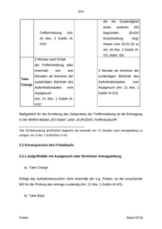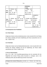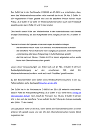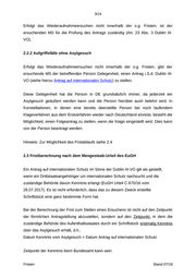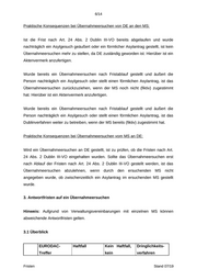 7/14 EURODAC- Treffer 2 Wochen nach 1 Monat nach Take Erhalt ÜE Erhalt ÜE ⁻⁻⁻ Back (Art. 25 Abs. 1 (Art. 25 Abs. 1 Dublin III-VO) Dublin III-VO) 2 Wochen nach vorgegebene Erhalt ÜE Frist; 2 Monate nach (Art. 28 Abs. 3 2 Monate nach spätestens Take Erhalt ÜE Dublin III-VO) Erhalt ÜE innerhalb 1 Charg (Art. 22 Abs. 1 (Art. 22 Abs. 1 Monats nach e Dublin III-VO) Dublin III-VO) Erhalt ÜE (Art. 22 Abs. 6 Dublin III-VO) 3.2 Konsequenzen des Fristablaufs 3.2.1 Take Charge Erfolgt keine Antwort auf das Aufnahmeersuchen, ist der ersuchte MS für die Prüfung des Antrags zuständig und hat die Verpflichtung, die Person aufzunehmen (Art. 22 Abs. 7 Dublin III-VO). 3.2.2 Take Back Erfolgt keine Antwort auf das Wiederaufnahmeersuchen, ist der ersuchte MS für die Prüfung des Antrags zuständig und hat die Verpflichtung, die Person wieder aufzunehmen (Art. 25 Abs. 2 Dublin III-VO). 4. Frist zur Remonstration Gem. Art. 5 Abs. 2 der Durchführungsverordnung hat der ersuchende MS die Möglichkeit eine erneute Prüfung seines Ersuchens zu verlangen, wenn er die Auffassung vertritt, dass die Ablehnung auf einem Irrtum beruht. Verlangen einer erneuten Prüfung eines Innerhalb von 3 Wochen nach Erhalt der Fristen Stand 07/19