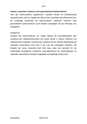 12/12 Attribut „nationales Verfahren nach gescheitertem Dublinverfahren“ Wird das Dublinverfahren abgebrochen, nachdem bereits ein Dublinbescheid zugestellt wurde, wird vor Abgabe der Akte an das zuständige Ankunftszentrum bzw. die zuständige Außenstelle die Aktenzusatzinfo „nationales Verfahren nach gescheitertem Dublinverfahren“ durch den/die zuständige/n SB des Referates 32C eingegeben. Hintergrund: Scheitert das Dublinverfahren z.B. wegen Ablaufs der Überstellungsfrist oder Ausübung des Selbsteintrittsrechtes und wurde bereits in diesem Verfahren ein Dublinbescheid zugestellt, erscheint das Verfahren bei der weiteren Bearbeitung als nationales Asylverfahren nicht mehr in der Liste der anhängigen Verfahren. Die Eingabe der neuen Zusatzinfo Akte führt dazu, dass das daraufhin für die Außenstellen entstehende zusätzliche Geschäftsvolumen für Entscheidungen im nationalen Asylverfahren statistisch abgebildet und abgefragt werden kann. Überstellung Stand 07/19