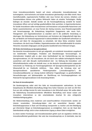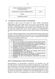 22 (ethische, rechtliche und soziale Aspekte der Technologieforschung) Rahmenprogramm empirische Bildungsforschung 2018 Futurium … [Ergänzungen Ressorts] … III. Wir etablieren eine offene Innovations- und Wagniskultur. Deutschland ist global vernetzt und profitiert von offenen Märkten, internationalem Wissensaustausch und freiem Handel, ebenso wie von einer EU ohne Schranken. Mit der zunehmenden Globalisierung schreitet auch die internationale Arbeitsteilung voran. Globale Innovations- und Wertschöpfungsketten werden komplexer und Innovationszyklen immer kürzer. Wir wollen diese Dynamik nutzen und mit unserer Forschungs- und Innovationspolitik in Deutschland eine Innovationskultur etablieren, die durch Offenheit, Agilität und Weitsicht geprägt ist. Wir werden nationale und globale Wissens- und Innovationsnetzwerke genauso stärken wie die Handlungs- und Leistungsfähigkeit der einzelnen Akteure. Dort, wo es die Wettbewerbsfähigkeit Deutschlands oder Europas entscheidend verbessert, werden wir übergreifende Infrastrukturen aufbauen und strukturbildende Impulse setzen. Unsere Innovationsförderung: (1) Offen: Wir sind überzeugt, dass ein modernes Innovationssystem verstärkt Frei- und Experimentierräume bereithalten muss, um neue Technologien zu erproben und neue Modelle für unternehmerisches Handeln und neue Formen des Lernens, Arbeitens und Zusammenlebens zu erkunden. (2) Systemisch: Wir haben ein systemisches Verständnis von Innovation, das Innovation als das Resultat von Kooperation und Interaktion einer Vielzahl unterschiedlicher Akteure begreift. (3) Anwendungsorientiert: Unser Konzept von Innovation reicht von der Grundlagenforschung bis zur Markteinführung. (4) Zukunftsgerichtet: Wir wollen die Entwicklung von Sprunginnovationen fördern, um langfristig international konkurrenzfähig zu bleiben. (5) Umfassend: Wir zielen auf technologische, nicht-technische und Soziale Innovation. Wissen zur Wirkung bringen: Transfer in die Anwendung Wissenschaftlerinnen und Wissenschaftler, Innovatorinnen und Innovatoren, aber auch potenzielle Nutzerinnen und Nutzer arbeiten im gesamten Innovationsprozess – von der Wissens- bis zur Wertschöpfung – Hand in Hand und bringen Forschungsergebnisse für die Bürgerinnen und Bürger unseres Landes in die Praxis. Den Transfer wollen wir als zentrale Säule unseres Forschungs- und Innovationssystems nachhaltig stärken und substanzielle Steigerungen erreichen. Wir werden den Kulturwandel in Hochschulen und Forschungseinrichtungen hin zu einem effektiveren Transfer ihrer Forschungsergebnisse zum Nutzen von Wirtschaft und Gesellschaft