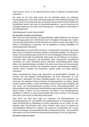 23 weiter forcieren und sie in der Wahrnehmung ihrer Rolle im regionalen Innovationssystem unterstützen. Hier wollen wir zum einen dafür sorgen, dass das vorhandene Wissen und vorliegende Forschungsergebnisse in eine breite Anwendung insbesondere beim Mittelstand gelangen. Zum anderen werden wir die Wege eben, dass aus Spitzenforschung schnell innovative Produkte und Geschäftsideen werden. Dazu nutzen wir Querschnittsmaßnahmen - etwa die Förderung einer frühzeitigen Validierung, von Clustern und Forschungscampi - und spezifische Transferansätze in den Fachprogrammen. [Anknüpfungspunkt: Transfer-Initiative BMWi] Wir unterstützen eine offene Innovationskultur Neue Formen der Zusammenarbeit, wie Ideenwettbewerbe, digitale Plattformen oder die Open Source-Bewegung setzen sich in vielen Bereichen durch. Mit digitalen Technologien ist es möglich, in kürzester Zeit große Mengen an Wissen abzurufen und zu teilen. Sie zeigen neue Wege auf, um Wissen in Wertschöpfung zu übersetzen. Und sie ermöglichen es bislang Unbeteiligten, am Innovationsgeschehen mitzuwirken. Die Bundesregierung wird eine offene Innovations- und Wagniskultur unterstützen, die kreative Ideen fördert und ungenutzte innovative Potenziale in Deutschland mobilisiert. Die Öffnung von Wissens- und Innovationsprozessen werden wir mit einer breitangelegten Initiative unterstützen – in Wirtschaft, Wissenschaft und Gesellschaft. Dafür werden wir die Förderung von innovativen Netzwerken weiter intensivieren und themenoffen junge, hochinnovative Zukunftscluster unterstützen. Wir wollen thematische Lock-ins aufbrechen, branchenübergreifende Ansätze fördern und Zukunftstechnologien erschließen. Wir werden neue Formen der Zusammenarbeit zwischen Wissenschaft, Wirtschaft und Gesellschaft, zwischen unterschiedlichen Disziplinen, zwischen Nutzern, Anbietern und Produzenten, zwischen großen und kleinen Akteuren unterstützen. Offene Innovationsformen bergen große ökonomische und gesellschaftliche Potentiale, sie erfordern aber auch geeignete Rahmenbedingungen und einen Kulturwandel. Für viele Unternehmen, insbesondere mit hohem Spezialisierungsgrad, wird es auch weiterhin darauf ankommen, ihre spezifischen Wissensvorsprünge und Kernkompetenzen zu schützen. Deshalb werden wir Räume schaffen, in denen Unternehmen mit ihren Partnern offen interagieren und neue Schutz- und Verwertungsstrategien erproben können. Demonstrationsvorhaben und Innovationslabore sollen Wissenschaft und Wirtschaft das experimentelle Umfeld bieten, sich für externes Wissen zu öffnen und neue Akteurinnen und Akteure in die Innovationsprozesse einzubinden. Im Rahmen von neuen Campusmodellen sollen Open Innovation, Crowd Sourcing, Open Science, Open Access und Open Data erprobt werden. Open Access und Open Data tragen zur Transparenz und Reproduzierbarkeit von Forschungsergebnissen bei und befördern die Qualitätssicherung im Forschungsprozess. Wir wollen die Bereitschaft zur Offenlegung von Wissen unterstützen und wir werden mit einer nationalen Open Access-Strategie weiter darauf hinwirken, Open Access als Standard des wissenschaftlichen Publizierens zu etablieren. Wir werden uns in Deutschland und in Europa weiter für ein bildungs- und wissenschaftsfreundliches Urheberrecht einsetzen – eine wesentliche Hürde haben wir mit dem Urheberrechts-Wissensgesellschafts-Gesetz im Juni 2017 genommen. Wir befördern Soziale Innovationen
