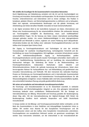 28 Wir schaffen die Grundlagen für die Zusammenarbeit in innovativen Netzwerken Durch Digitalisierung und Globalisierung verändern sich die Art und die Geschwindigkeit von Forschung und Innovation, Kommunikation und Kooperation. Für die einzelnen Forscherinnen und Forscher, Unternehmerinnen und Unternehmer wird es immer wichtiger, ihre Position in komplexen, globalen Wissens- und Wertschöpfungsnetzwerken zu definieren und zu behaupten. Dabei sind regionale, vertrauensbasierte Beziehungen und die globale Vernetzung und Arbeitsteilung zwei Seiten derselben Medaille: Innovation ist heute Gemeinschaftsarbeit. In der digital vernetzten Welt ist der kontrollierte Austausch von Daten, Informationen und Wissen eine Grundvoraussetzung für das wissenschaftliche Arbeiten. Die umfassende Nutzung von Forschungsdaten ermöglicht die Beantwortung neuer, auch multidisziplinärer wissenschaftlicher Fragen. Für die Nutzung von Daten müssen international anschlussfähige Lösungen gefunden werden. Um unsere Wettbewerbsfähigkeit in einer datengetriebenen Wissenschaft und Wirtschaft zu sichern, ergänzen wir unsere Förderung durch übergreifende Infrastruktur-Ansätze wie den Aufbau einer nationalen Forschungsdateninfrastruktur und den Aufbau einer European Open Science Cloud. Der Zugang zu Forschungsinfrastrukturen und Technologien ist eine der zentralen Voraussetzungen für exzellente Grundlagenforschung, technologischen Fortschritt und die Erschließung von neuen Forschungsgebieten. Mit tragfähigen, vernetzten Infrastrukturen werden wir den institutionenübergreifenden Zugang zu Rechnerkapazitäten, großen Forschungsinfrastrukturen und den jeweils neusten Technologien sicherstellen. Damit wollen wir auch zur Qualitätssicherung, Standardisierung und zur Ausbildung des wissenschaftlichen Nachwuchses beitragen. Die Einbindung der Nutzer in die Weiterentwicklung von Forschungsinfrastrukturen, insbesondere Hochschulen sowie Industrie- und Wirtschaftsunternehmen, fördert die optimale Ausnutzung der Infrastrukturen, bietet einen hervorragenden Rahmen für hochqualifizierte Aus- und Weiterbildung und gewährleistet eine innovative Instrumentierung und Methodik. Mit dem Instrument des nationalen Roadmap- Prozess zur Priorisierung von Forschungsinfrastrukturen und in internationaler Zusammenarbeit werden wir den Aufbau komplexer und kostenintensiver Forschungsinfrastrukturen für alle Wissenschaftsgebiete ermöglichen. Unsere Maßstäbe dafür sind hohe wissenschaftliche Qualität, eine wirtschaftlich belastbare Planung und große gesellschaftliche Bedeutung. Wir setzen auf europäische und internationale Innovationspartnerschaften Als Forschungs- und Innovationsstandort ist es für Deutschland essentiell, in weltweite Wissensströme und Wertschöpfungsketten integriert zu sein. Eine gelungene internationale Vernetzung bedeutet einen unmittelbaren Wettbewerbsvorteil. Mit der Strategie zur Internationalisierung von Bildung, Wissenschaft und Forschung gestaltet die Bundesregierung diesen Weg aktiv. Mit der Internationalisierung der Hightech-Strategie 2025 fördert die Bundesregierung Exzellenz durch weltweite Kooperation und stärkt Deutschlands Innovationskraft. In Europa werden wir die Bildungs- und Forschungszusammenarbeit stärker verknüpfen, um die Basis des Zusammenlebens in einer friedlichen und leistungsfähigen Europäischen Union zu stärken. Wir werden neue Akzente für den Europäischen Forschungsraum und die Innovationsunion setzen und den Aufbau eines Europäischen Innovationsrates unterstützen. Forschungsthemen von europäischem Mehrwert werden wir gemeinsam voranbringen. Wir werden neue Instrumente entwickeln, um die Unterschiede in der Innovationskraft der