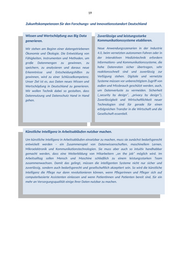19 Zukunftskompetenzen für den Forschungs- und Innovationsstandort Deutschland Wissen und Wertschöpfung aus Big Data Zuverlässige und leistungsstarke generieren. Kommunikationssysteme etablieren. Wir stehen am Beginn einer datengetriebenen Neue Anwendungsszenarien in der Industrie Ökonomie und Ökologie. Die Entwicklung von 4.0, beim vernetzten autonomen Fahren oder in Fähigkeiten, Instrumenten und Methoden, um der interaktiven Medizintechnik erfordern große Datenmengen zu gewinnen, zu Informations- und Kommunikationssysteme, die speichern, zu analysieren und daraus neue hohe Datenraten sicher übertragen, sehr Erkenntnisse und Entscheidungshilfen zu reaktionsschnell sind und zuverlässig zur gewinnen, wird zu einer Schlüsselkompetenz. Verfügung stehen. Digitale und vernetzte Unser Ziel ist es, aus Daten neues Wissen und Systeme müssen vor unberechtigtem Zugriff von Wertschöpfung in Deutschland zu generieren. außen und Missbrauch geschützt werden, auch, Wir wollen Technik dabei so gestalten, dass um Datenverluste zu vermeiden. Sicherheit Datennutzung und Datenschutz Hand in Hand („security by design“, „privacy by design“), gehen. Zuverlässigkeit und Wirtschaftlichkeit neuer Technologien sind für gerade für einen erfolgreichen Transfer in die Wirtschaft und die Gesellschaft essentiell. Künstliche Intelligenz in Arbeitsabläufen nutzbar machen. Um künstliche Intelligenz in Arbeitsabläufen einsetzbar zu machen, muss sie zunächst bedarfsgerecht entwickelt werden – ein Zusammenspiel von Datenwissenschaften, maschinellem Lernen, Mikroelektronik und Kommunikationstechnologien. Sie muss aber auch so intuitiv handhabbar gemacht werden, dass eine Weiterbildung von Mitarbeitern „on the job“ möglich wird. Im Arbeitsalltag sollen Mensch und Maschine schließlich zu einem leistungsstarken Team zusammenwachsen. Damit das gelingt, müssen die intelligenten Systeme nicht nur sicher und zuverlässig, sondern auch bedarfsgerecht und gesellschaftlich akzeptiert sein. So wird die künstliche Intelligenz die Pflege nur dann revolutionieren können, wenn Pflegerinnen und Pfleger sich auf computerbasierte Assistenten einlassen und wenn Patientinnen und Patienten bereit sind, für ein mehr an Versorgungsqualität einige ihrer Daten nutzbar zu machen.