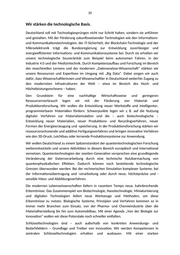 20 Wir stärken die technologische Basis. Deutschland soll mit Technologiesprüngen nicht nur Schritt halten, sondern sie anführen und gestalten. Mit der Förderung zukunftsweisender Technologien wie den Informations- und Kommunikationstechnologien, der IT-Sicherheit, der Blockchain-Technologie und der Mikroelektronik trägt die Bundesregierung zur Entwicklung zuverlässiger und energieeffizienter Informations- und Kommunikationssysteme bei. Durch sie erhalten wir unsere technologische Souveränität zum Beispiel beim autonomen Fahren, in der Industrie 4.0 und der Medizintechnik. Durch Kompetenzaufbau und Forschung im Bereich des maschinellen Lernens und der modernen „Datenanalyse-Wissenschaft“ stärken wir unsere Ressourcen und Expertisen im Umgang mit „Big Data“. Dabei sorgen wir auch dafür, dass Wissenschaftlerinnen und Wissenschaftler in Deutschland weiterhin Zugang zu den modernsten Infrastrukturen der Welt – etwa im Bereich des Hoch- und Höchstleistungsrechnens – haben. Den Grundstein für eine nachhaltige Wirtschaftsweise und geringeren Ressourcenverbrauch legen wir mit der Förderung von Material- und Produktionsforschung. Wir wollen die Entwicklung neuer Werkstoffe und intelligenter, programmierbarer Materialien fördern. Schwerpunkte legen wir z. B. auf die Nutzung digitaler Verfahren zur Materialsimulation und die – auch biotechnologische – Entwicklung neuer Materialien, neuer Produktions- und Recyclingverfahren, neuer Formen der Energieerzeugung und -speicherung. In der Produktionsforschung stärken wir ressourcenschonende und additive Fertigungsverfahren und bringen innovative Verfahren wie den 3D-Druck, Leichtbau oder lernende Produktionssysteme zur Anwendung. Wir wollen Deutschland zu einem Spitzenstandort der quantentechnologischen Forschung weiterentwickeln und unsere Aktivitäten in diesem Bereich europäisch und international vernetzen. Quantentechnologien der zweiten Generation versprechen eine grundlegende Veränderung der Datenverarbeitung durch eine technische Nutzbarmachung von quantenphysikalischen Effekten. Dadurch können noch bestehende technologische Grenzen überwunden werden: Bei der rechnerischen Simulation komplexer Systeme, bei der Informationsübertragung und -verarbeitung oder durch neue, höchstpräzise und - sensible Mess- und Abbildungsverfahren. Die modernen Lebenswissenschaften liefern in rasantem Tempo neue, bahnbrechende Erkenntnisse. Das Zusammenspiel von Biotechnologie, Nanotechnologie, Miniaturisierung und digitalen Technologien liefert neue Werkzeuge und Methoden, um diese Erkenntnisse zu nutzen. Biologische Systeme, Prinzipien und Verfahren kommen so in immer mehr Branchen zum Einsatz, von der Pharma- und Chemieindustrie über die Materialherstellung bis hin zum Automobilbau. Mit einer Agenda „Von der Biologie zur Innovation“ wollen wir diese Potenziale noch schneller entfalten. Schlüsseltechnologien sind – auch außerhalb von konkreten Anwendungs- und Bedarfsfeldern – Grundlage und Treiber von Innovation. Wir werden Kompetenzen in zentralen Schlüsseltechnologien erhalten und ausbauen. Mit einer starken