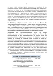 24 und unsere Freizeit verbringen. Digitale Kompetenzen sind unerlässlich für alle Bürgerinnen und Bürger unserer modernen Wissensgesellschaft. Umso wichtiger ist es, Nutzerinnen und Nutzer bei der Technologieentwicklung frühzeitig einzubeziehen. Technologische Lösungen der Zukunft müssen sicher, zuverlässig, wirtschaftlich und vor allem bedarfsgerecht sein – darauf werden wir in unserer Förderung hinwirken. Wir wollen Neugier auf digitale Technologien wecken und Souveränität im Umgang mit ihnen schaffen. Wir werden darüber hinaus neue Formen der Beteiligung von Bürgerinnen und Bürgern in Wissenschaft und Forschung erproben. Die „Citizen Science“ werden wir weiter voranbringen, um das Wissen der Vielen – das große Potenzial von Bürgerwissen – nutzbar zu machen. Die Entwicklung partizipativer Formate stellen wir in das Zentrum der Wissenschaftskommunikation. Wir werden – etwa im Rahmen der Wissenschaftsjahre – den offenen Dialog zwischen verschiedenen Akteuren aus Wissenschaft, Gesellschaft und Politik zu Zukunftsthemen führen und ausbauen. Wir sehen es als eine gemeinsame und zentrale Aufgabe von Wissenschaft und Politik an, den gesellschaftlichen Mehrwert auch der Grundlagenforschung allgemeinverständlicher und bürgernäher zu vermitteln. Zukunftspolitik setzt Beurteilungskompetenzen voraus: Wir müssen Veränderungsprozesse verstehen, um sie aktiv gestalten zu können. Die Forschungsförderung zu den Schlüsseltechnologien soll deshalb soziale und geisteswissenschaftliche Begleitforschung beinhalten. Die Digitalisierung besser zu verstehen, sie zum Wohle der Gesellschaft nutzbar zu machen und Impulse für wissenschaftlich fundierte Debatten zu geben, ist Aufgabe des „Weizenbaum-Instituts für die vernetzte Gesellschaft – das Deutsche Internet-Institut“. Auch in anderen Bereichen werden wir die Betrachtung von ethischen, rechtlichen und sozialen Aspekten von Forschung und Innovation verstärkt unterstützen und auf einen chancenorientierten und verantwortungsvollen Umgang hinwirken. Wir schaffen – etwa mit dem Futurium – Orte des kritischen Nachdenkens über technologische, aber auch über gesellschaftliche Veränderungen. Bei der Förderung von Geistes-, Kultur- und Sozialwissenschaften werden u. a. die Themen Migration, Integration und gesellschaftlicher Zusammenhalt, Demokratie und europäische Integration, Radikalisierungsprozesse, Konfliktursachen und -bewältigungsstrategien im Fokus stehen. Forschungs- und innovationspolitische Initiativen 2018-2021 Auswahl der Einrichtungen, die ein Mitte 2018 Gründungskonzept für das multidisziplinäre Institut für Gesellschaftlichen Zusammenhalt erarbeiten Neues Programm zur Förderung der Geistes- Ende 2018 und Sozialwissenschaften … ….