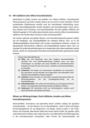 25 III. Wir etablieren eine offene Innovationskultur. Deutschland ist global vernetzt und profitiert von offenen Märkten, internationalem Wissensaustausch und freiem Handel, ebenso wie von einer EU ohne Schranken. Mit der zunehmenden Globalisierung schreitet auch die internationale Arbeitsteilung voran. Globale Wertschöpfungsketten werden komplexer und Innovationszyklen immer kürzer. Dies erfordert eine Forschungs- und Innovationspolitik, die durch Agilität, Offenheit und Weitsicht geprägt ist. Wir wollen diese Dynamik nutzen und eine offene Innovationskultur etablieren, die kreative Ideen und deren rasche Umsetzung fördert. Wir werden nationale und globale Wissens- und Innovationsnetzwerke genauso stärken wie die Handlungs- und Leistungsfähigkeit der einzelnen Akteure. Dort, wo es die Wettbewerbsfähigkeit Deutschlands oder Europas entscheidend verbessert, werden wir übergreifende Infrastrukturen aufbauen und strukturbildende Impulse setzen. Dort, wo Lösungen für große Herausforderungen nur in Kooperation aller Akteure gefunden werden können, werden wir Wissenschaft, Wirtschaft und Gesellschaft hinter gemeinsamen Zielen vereinen. Unsere Innovationsförderung: (1) Offen: Wir sind überzeugt, dass eine moderne Innovationskultur verstärkt Frei- und Experimentierräume eröffnen muss, um neue Technologien zu erproben und neue Modelle für unternehmerisches Handeln und neue Formen des Lernens, Arbeitens und Zusammenlebens zu erkunden. (2) Systemisch: Wir haben ein systemisches Verständnis von Innovation, das Innovation als das Resultat von Kooperation und Interaktion einer Vielzahl unterschiedlicher Akteure begreift. (3) Lückenlos: Unser Konzept von Innovation umspannt die ganze Kette der Wissensproduktion, von der Grundlagenforschung bis zur Markteinführung. (4) Zukunftsgerichtet: Wir wollen die Entwicklung von Sprunginnovationen fördern, um langfristig international konkurrenzfähig zu bleiben. (5) Umfassend: Wir betrachten nicht nur technologische, sondern auch nicht-technische und soziale Innovation. Wissen zur Wirkung bringen: Durch effiziente, kreative und offene Innovationsprozesse. Wissenschaftler, Innovatoren und potenzielle Nutzer arbeiten entlang der gesamten Innovationskette – von der Wissens- bis zur Wertschöpfung - Hand in Hand und bringen Forschungsergebnisse für die Bürgerinnen und Bürger unseres Landes in die Praxis. Nutzer und Anwender übernehmen dabei eine immer aktivere Rolle: Sie ergreifen selbst unternehmerische Initiative oder tragen dazu bei, neue Blickwinkel und Erfahrungswissen in das Innovationssystem einzuspeisen. Neue Formen der Zusammenarbeit, wie