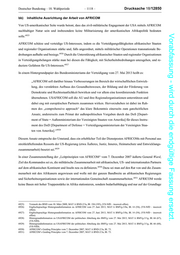 Deutscher Bundestag 18. Wahlperiode 1116 Drucksache 18/12850 6911 Staaten hätten eine solche abgelehnt. In einer Hintergrundinformation des Bundesministeriums der Verteidi- gung heißt es zu den Gründen hierfür: Viele afrikanische Entscheidungsträger haben Misstrauen gegenüber den von USA Seite geäußerten sicherheitspolitischen und humanitären Absichten geäußert, die hinter dem Pro- Vorabfassung - wird durch die endgültige Fassung ersetzt. jekt USAFRICOM stehen sollen. Darüber hinaus vermuten sie, dass die USA-Regierung ihre Außenpolitik unter dem Deckmantel des Antiterrorkampfes zu militarisieren beabsich- tigt und in erster Linie die Sicherung der Versorgung mit Rohstoffen vom afrikanischen 6912 Kontinent im Fokus des USA-Interesses stehen könnte. Zu der Entscheidung Präsident Obamas hat der Zeuge Dr. Steinmeier geäußert: Ich weiß nicht, ob dauerhaft wirklich dauerhaft heißt oder ob AFRICOM zunächst mit Blick auf die Entwicklungen vor allen Dingen in Nordafrika deshalb in Stuttgart bleibt. Ansonsten sind wir als Auswärtiges Amt jedenfalls nicht in diese amerikanischen Planun- gen einbezogen worden. Es kann damit zu tun haben, dass aufgrund der Turbulenzen in 6913 Nordafrika gegenwärtig an keine Verlegung gedacht wird. b) Rechtliche Rahmenbedingungen für die Arbeit von AFRICOM Auch für die Ansiedlung von AFRICOM auf deutschem Staatsgebiet ist nach Auskunft der Bundesregierung der Vertrag über den Aufenthalt ausländischer Streitkräfte in der Bundesrepublik vom 23. Oktober 1954 die einschlä- 6914 gige Rechtsgrundlage. Eine Zustimmung des Parlaments zur Errichtung von AFRICOM gemäß Art. 59 Abs. 2 des Grundgesetzes (GG) 6915 ist nicht erfolgt. Art. 59 Abs. 2 GG lautet: Verträge, welche die politischen Beziehungen des Bundes regeln oder sich auf Gegen- stände der Bundesgesetzgebung beziehen, bedürfen der Zustimmung oder der Mitwirkung der jeweils für die Bundesgesetzgebung zuständigen Körperschaften in der Form eines Bundesgesetzes. Für Verwaltungsabkommen gelten die Vorschriften über die Bundesver- waltung entsprechend. Nach Auffassung der Bundesregierung war die Regelung des Art. 59 Abs. 2 GG nicht einschlägig, weil der Auf- enthalt von Streitkräften der USA bereits durch den Aufenthaltsvertrag legitimiert sei, für den ein Vertragsgesetz 6916 gemäß Art. 59 Abs. 2 Satz 1 GG vorliege. 6911) Hintergrundinformation zu USAFRICOM der politischen Abteilung des BMVg vom 27. Mai 2013, MAT A BMVg-3/1g, Bl. 66 (68), (VS-NfD insoweit offen). 6912) Hintergrundinformation zu USAFRICOM der politischen Abteilung des BMVg vom 27. Mai 2013, MAT A BMVg-3/1g, Bl. 66 (68), (VS-NfD insoweit offen). 6913) Dr. Steinmeier, Protokoll-Nr. 91 I, S. 62. 6914) Antwort der Bundesregierung auf die Kleine Anfrage der Fraktion DIE LINKE. vom 23. Dezember 2013, BT-Drs. 18/237, S. 3. 6915) Antwort der Bundesregierung auf die Kleine Anfrage der Fraktion DIE LINKE. vom 23. Dezember 2013, BT-Drs. 18/237, S. 4. 6916) Antwort der Bundesregierung auf die Kleine Anfrage der Fraktion DIE LINKE. vom 23. Dezember 2013, BT-Drs. 18/237, S. 3.