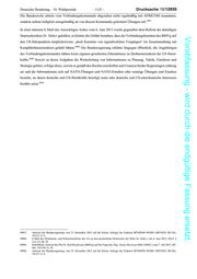 Deutscher Bundestag 18. Wahlperiode 1124 Drucksache 18/12850 Während das BMVg in seinem Entwurf für einen Ergebnisvermerk zu dem Treffen von einem Einvernehmen, dass [ ] kein Druck auf US-Seite ausgeübt werden kann, sondern die Diskussion ausgehalten werden muss 6976 6977 ausging , bestand das Auswärtige Amt darauf, die Einwände der Staatssekretärin festzuhalten. Der Zeuge Dr. Ney hat zusammenfassend bekundet: Vorabfassung - wird durch die endgültige Fassung ersetzt. Per se ist ein völkerrechtswidriges Tun der Amerikaner in Ramstein und AFRICOM nicht 6978 zu belegen. Am 4. Juni 2013 fand auch ein Gespräch zwischen Major General Hooper und dem Leiter der für sicherheitspo- 6979 litische Angelegenheiten zuständigen Unterabteilung Pol I im BMVg statt, an dem auch der Zeuge Luther teilnahm. In einer Sprechempfehlung zu diesem Gespräch heißt es: Das DEU Parlament ist nach verschiedenen Presseberichten an der möglichen Rolle USA- FRICOM hinsichtlich des Einsatzes von USA UAV zur Bekämpfung von Zielen in Afrika 6980 interessiert. 6981 Der Punkt wurde bei dem Treffen indes nicht aufgegriffen. bb) Auskünfte der Bundesregierung auf parlamentarische Anfragen Die Bundesregierung äußerte am 23. Dezember 2013, dass sie keine eigene Kenntnis von einer Beteiligung AFRICOMs an der Planung, Anweisung oder Unterstützung gezielter Tötungen außerhalb bewaffneter Konflikte 6982 habe. Über die öffentlich bekannten Aktivitäten von AFRICOM hinaus habe die Bundesregierung keine eige- 6983 nen Erkenntnisse über konkrete Einsätze dieses Kommandos. Am 31. Mai 2013 habe der damalige US-Außenminister John Kerry betont, dass die in Deutschland stationierten 6984 Streitkräfte das geltende Recht einhalten würden ; der damalige US-Präsident Obama habe am 19. Juni 2013 6985 versichert, dass Deutschland kein Ausgangspunkt für Drohnenangriffe zur Terrorbekämpfung sei. Nach Auskunft der Bundesregierung vom 7. Mai 2014 [ ] ist festzuhalten, dass die Vereinigten Staaten von Amerika Einsätze unbemannter Luftfahrzeuge in Afrika keineswegs mit Deutschland koordinieren und es keine Aktivitäten 6986 der Bundeswehr gibt, die einer Koordinierung derartiger Einsätze dienten. 6976) Entwurf eines Ergebnisvermerks zum Jour Fixe am 10. Juni 2013, MAT A AA-3/2, Bl. 43 (45), (VS-NfD insoweit offen). 6977) E-Mail des Referatsleiters 201 im AA zur Mitzeichnung des Ergebnisvermerks vom 12. Juni 2013, MAT A AA-3/2, Bl. 41 sowie Kom- mentar auf dem Entwurf eines Ergebnisvermerks zum Jour Fixe am 10. Juni 2013, MAT A AA-3/2, Bl. 43 (45), (VS-NfD insoweit offen). 6978) Dr. Ney, Protokoll-Nr. 89 I, S. 39. 6979) Organigramm des BMVg, Stand: Januar 2013, MAT A BMVg-2e, Bl. 159. 6980) Sprechempfehlung für UAL Pol I vom 4. Juni 2013, MAT A BMVg-3/3a, Bl. 18. 6981) Vgl. Gesprächsvermerk des BMVg vom 4. Juni 2013, MAT A BMVg-3/3a, Bl. 21 ff. (VS-NfD insoweit offen). 6982) Antwort der Bundesregierung vom 23. Dezember 2013 auf die Kleine Anfrage der Fraktion BÜNDNIS 90/DIE GRÜNEN, BT-Drs. 18/237, S. 7. 6983) Antwort der Bundesregierung vom 23. Dezember 2013 auf die Kleine Anfrage der Fraktion BÜNDNIS 90/DIE GRÜNEN, BT-Drs. 18/237, S. 4. 6984) Antwort der Bundesregierung vom 23. Dezember 2013 auf die Kleine Anfrage der Fraktion BÜNDNIS 90/DIE GRÜNEN, BT-Drs. 18/237, S. 4. 6985) Antwort der Bundesregierung vom 23. Dezember 2013 auf die Kleine Anfrage der Fraktion BÜNDNIS 90/DIE GRÜNEN, BT-Drs. 18/237, S. 10. 6986) Schriftliche Antwort des Staatsministers Michael Roth (AA) auf die Frage der Abg. Heike Hänsel (DIE LINKE.) vom 7. Mai 2014, Plenarprotokoll 18/32, S. 2685.