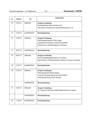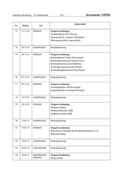 Drucksache 18/6700 – 932 – Deutscher Bundestag – 18. Wahlperiode Gegenstand Nr. Datum Art Maik Schuparis Jens Jenssen Wolfgang Hertinger, Präsident des Landeskriminal-amtes Rhein- land-Pfalz Bärbel Tewes-Heiseke Johannes Kahrs, MdB 25 05.02.15 nichtöffentlich Beratungssitzung 26 05.02.15 öffentlich Zeugenvernehmung Christian Noll Michael Hartmann, MdB 27 25.02.15 nichtöffentlich Beratungssitzung 28 25.02.15 öffentlich Zeugenvernehmung Kriminaldirektor Jürgen Spaniol Kriminalrat Christoph Becker Regierungsdirektor Matthias Meyer 29 04.03.15 nichtöffentlich Beratungssitzung 30 04.03.15 öffentlich/ Zeugenvernehmung nichtöffentlich Leitender Kriminaldirektor Dieter Schiffels Dr. Sabine Vogt, Direktorin beim Bundeskriminalamt Jürgen Hoffmann 31 19.03.15 nichtöffentlich Beratungssitzung 32 19.03.15 nichtöffent- Zeugenvernehmung lich/öffentlich Beamter „X“ Leitender Regierungsdirektor Heiko Braß Ministerialdirektor Paul Fietz Peter Henzler, Vizepräsident des Bundeskriminalamtes nichtöffentlich Beratungssitzung 33 25.03.15 nichtöffentlich Beratungssitzung
