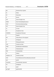 Deutscher Bundestag – 18. Wahlperiode – 937 – Drucksache 18/6700 dpa. Deutsche-Presse-Agentur Dr. Doktor DS Datenschutz dt. deutsch EDT Eastern Daylight Time EKHK Erster Kriminalhauptkommissar EMA Einwohnermeldeamtsanfrage EST Eastern Standard Time etc. et cetera EU Europäische Union EUROPOL Europäisches Polizeiamt f. folgende FBI Federal Bureau of Investigation ff. fortfolgende FI Führungsinformation FFM Frankfurt am Main FFSB federführender Sachbearbeiter FK Fachkommissariat FKK Freikörperkultur Fn. Fußnote Frankfurt a. M. Frankfurt am Main GBA Generalbundesanwalt/Generalbundesanwaltschaft gem. gemäß Generalsek. Generalsekretär/-sekretariat GG Grundgesetz gg gegen ggf./ggfls. gegebenenfalls