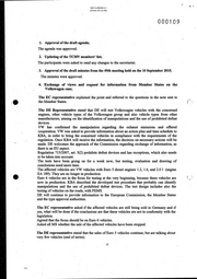 MAT-A-BMUB-2-1 [Ordner 46 von 60] 000109 1. Approval of the draft agenda; The agenda was approved. 2. Updating of the TCMV members’ list; The participants were asked to send any changes to the secretariat. 3. Approval of the draft minutes from the 49th meeting held on the 10 September 2015; The minutes were approved. 4. Exchange of views and request for information from Member States on the Volkswagen case; The EC representative explained the point and referred to the questions in the note sent to t the Member States. The DE Representative stated that DE will test Volkswagen vehicles with the concerned engines, other vehicle types of the Volkswagen group and also vehicle types from other manufacturers, aiming on the identification of manipulations and the use of prohibited defeat devices. VW has confirmed the manipulation regarding the exhaust emissions and offered cooperation. VW was asked to provide information about an action plan and time schedule to KBA, in order to bring the concerned vehicles in compliance with the requirements of the regulation. Once KBA will receive the information, the decision on necessary actions will be made. DE welcomes the approach of the Commission regarding exchange of information, as there is an EU aspect. Regulation 715/2007, art. 5(2) prohibits defeat devices and has exceptions, which also needs to be taken into account. The tests have been going on for a week now, but testing, evaluation and drawing of conclusion^ need more time. The affected vehicles are VW vehicles with Euro 5 diesel engines 1.2, 1.6, and 2.0 1 (engine EA 189). They are no longer in production. Euro 6 vehicles are in the focus for testing at the very beginning, because these vehicles are now in production. KBA described the developed test procedure that probably can identify manipulations and the use of prohibited defeat devices. The test design includes also the testing of vehicles on the roads, with PEMS. DE will continue to provide information to the European Commission, the Member States and the type approval authorities. The EC representative asked if the affected vehicles are still being sold in Germany and if yes, what will be done if the conclusions are that these vehicles are not in conformity with the legislation. Agreed that the focus should be on Euro 6 vehicles. Asked all MS whether the sale of the affected vehicles have been stopped. The DE representative stated that the sales of Euro 5 vehicles Continue, but are talking about very few vehicles (end of series). 2 113