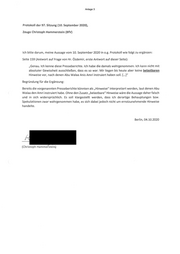 Anlage 3 Protokoll der 97. Sitzung (10. September 2020), Zeuge Christoph Hammerstein (BfV) Ich bitte darum, meine Aussage vom 10. September 2020 in o.g. Protokoll wie folgt zu ergänzen: Seite 159 (Antwort auf Frage von Hr. Özdemir, erste Antwort auf dieser Seite): „Genau. Ich kenne diese Presseberichte. ich habe die damals wahrgenommen. Ich kann nicht mit absoluter Gewissheit ausschließen, dass es so war. Mir liegen bis heute aber keine belastbaren Hinweise vor, nach denen Abu Walaa Anis Amri instruiert haben soll. [...]" Begründung für die Ergänzung: Bereits die vorgenannten Presseberichte könnten als „Hinweise" interpretiert werden, laut denen Abu Walaa den Amri instruiert habe. Ohne den Zusatz „belastbare" Hinweise wäre die Aussage daher falsch und in sich widersprüchlich. Es soll klargestellt werden, dass ich derartige Behauptungen bzw. Spekulationen zwar wahrgenommen habe, es sich dabei jedoch nicht um ernstzunehmende Hinweise handelte. Berlin, 04.10.2020 (Christoph Hammerstein)