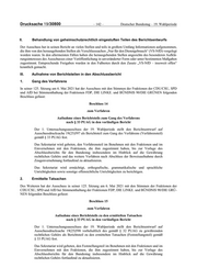 Drucksache 19/30800 – 142 – Deutscher Bundestag – 19. Wahlperiode II. Behandlung von geheimschutzrechtlich eingestuften Teilen des Berichtsentwurfs Der Ausschuss hat in seinen Bericht an vielen Stellen und teils in großem Umfang Informationen aufgenommen, die ihm von den herausgebenden Stellen als Verschlusssachen „Nur für den Dienstgebrauch“ (VS-NfD) vorgelegt worden waren. In den allermeisten Fällen haben die herausgebenden Stellen angesichts des besonderen Aufklä rungsinteresses des Ausschusses einer Veröffentlichung in unveränderter Form oder unter bestimmten Maßgaben zugestimmt. Entsprechende Freigaben wurden in den Fußnoten durch den Zusatz „VS-NfD – insoweit offen“ kenntlich gemacht. III. Aufnahme von Berichtsteilen in den Abschlussbericht 1. Gang des Verfahrens In seiner 125. Sitzung am 6. Mai 2021 hat der Ausschuss mit den Stimmen der Fraktionen der CDU/CSU, SPD und AfD bei Stimmenthaltung der Fraktionen FDP, DIE LINKE. und BÜNDNIS 90/DIE GRÜNEN folgenden Beschluss gefasst: Beschluss 14 zum Verfahren Aufnahme eines Berichtsteils zum Gang des Verfahrens nach § 33 PUAG in den vorläufigen Bericht Der 1. Untersuchungsausschuss der 19. Wahlperiode stellt den Berichtsentwurf auf Ausschussdrucksache 19(25)597 als Berichtsteil zum Gang des Verfahrens (Verfahrensteil) gemäß § 33 PUAG fest. Das Sekretariat wird gebeten, den Verfahrensteil im Benehmen mit den Fraktionen und im Einvernehmen mit den Fraktionen, die ihm zugestimmt haben, bis zur Vorlage des Abschlussberichts für den Bundestag insbesondere im Hinblick auf die Gewährung rechtlichen Gehörs und das weitere Verfahren nach Abschluss der Beweisaufnahme durch Zeugenvernehmung fortlaufend zu aktualisieren. Das Sekretariat wird ermächtigt, orthografische, grammatikalische und sprachliche Unrichtigkeiten sowie sonstige offensichtliche Unrichtigkeiten zu berichtigen. 2. Ermittelte Tatsachen Des Weiteren hat der Ausschuss in seiner 125. Sitzung am 6. Mai 2021 mit den Stimmen der Fraktionen der CDU/CSU, SPD und AfD bei Stimmenthaltung der Fraktionen FDP, DIE LINKE. und BÜNDNIS 90/DIE GRÜ NEN folgenden Beschluss gefasst: Beschluss 15 zum Verfahren Aufnahme eines Berichtsteils zu den ermittelten Tatsachen nach § 33 PUAG in den vorläufigen Bericht Der 1. Untersuchungsausschuss der 19. Wahlperiode stellt den Berichtsentwurf auf Ausschussdrucksache 19(25)598 vorbehaltlich des gemäß § 32 PUAG zu gewährenden rechtlichen Gehörs als Berichtsteil zu den ermittelten Tatsachen (Feststellungsteil) gemäß § 33 PUAG fest. Das Sekretariat wird gebeten, den Feststellungsteil im Benehmen mit den Fraktionen und im Einvernehmen mit den Fraktionen, die ihm zugestimmt haben, bis zur Vorlage des Abschlussberichts für den Bundestag insbesondere im Hinblick auf die Gewährung rechtlichen Gehörs fortlaufend zu aktualisieren.