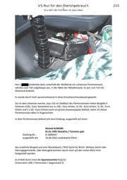 VS-Nur für den Dienstgebrauch 215 2 CD zu MAT A BE-15-35 Ordner 142_Datei 2, Blatt 2 Herr L entdeckte dann unterhalb der Wolldecke ein schwarzes Portemonnaie, welches zum Teil aufgeklappt war, in der Nähe der Mittelkonsole. Es war zum Teil mit Glasstaub bedeckt. Es wurde durch mich spurenschonend in einen Druckverschlussbeutel gepackt. Da ich aber erkennen konnte, dass sich im Geldfach des Portemonnaies neben Bargeld in Scheinen (230,- Euro, bestehend aus 1x 100,- Euro-Schein, 2x 50,- Euro-Schein, 1x 20,- Euro- Schein und 1 x 10,- Euro-Schein) auch ein grünes Ausweispapier befand, nahm ich dieses Portemonnaie näher in Augenschein. In dem Portemonnaie befand sich eine Duldung, ausgestellt auf einen Ahmed ALMASRI 01.01.1995 Skendiria / Tunesien geb. Duldung-Nr.: Q 1684443 ausgestellt am: 16.08.2016 Landratsamt Kleve das erwähnte Bargeld und eine Monatskarte / BVG-Karte für Berlin. Weitere Zettel oder Kleinstgegenstände, oder Münzgeld konnten durch mich auf den ersten Blick nicht festgestellt werden. Es erhielt durch mich die Spurennummer 5.3.1.1 (Innenraum LKW / Fahrerseite / Gegenstand 1)