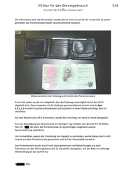 VS-Nur für den Dienstgebrauch 216 3 CD zu MAT A BE-15-35 Ordner 142_Datei 2, Blatt 3 Die Information über die Personalien wurden durch mich um 16.45 Uhr an das LKA 11 weiter gemeldet, das Portemonnaie wieder spurenschonend verpackt. (Dokumentation der Duldung und Ansicht des Portemonnaies) Kurze Zeit später wurde mir mitgeteilt, dass die Duldung unverzüglich durch das LKA 5 abgeholt wird. Dazu verpackte ich die Duldung spurenschützend einzeln und als Spur 5.3.1.1.1 in einen Druckverschlussbeutel und zusätzlich in einen Papierumschlag, den ich verschloss. Als zwei Beamte des LKA 5 erschienen, wurde der Umschlag von Hand zu Hand übergeben. Kurz vor Beendigung der Spurensuche am heutigen Tag meldete sich das LKA KTI 42 (DNA), Herr Dr. K , der auch das Portemonnaie als Spurenträger umgehend zwecks Spurensicherung anforderte. Um Formalitäten zwecks der Einzahlung von Bargeld zu vermeiden, wurde dieses durch mich vorerst aus dem Portemonnaie genommen und auf der Dienststelle verwahrt. Das Portemonnaie wurde durch mich dann gemeinsam mit Abwischungen aus dem Führerhaus an den Führungsdienst LKA 11 persönlich übergeben, mit der Bitte um sofortige Weiterleitung an das LKA KTI 42. B , KHK