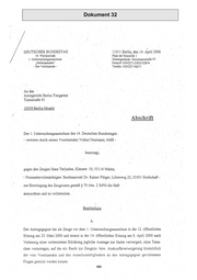Dokument 32 DEUTSCHER BUNDESTAG 11011 Berlin, den 14. April 2000 14. Wahlp~riode · Platz der. Republik I 1. Untersuchungsausschuss Dienstgebäucie: Dorotheenstraße 97 "Parteispenden" Fernruf: 030/227-32853/32854 - Der Vorsitzende " Telefax: 030/227-3627 I An das Amtsgericht Berlin-Tiergarten Tun11Straße 91 10559 Berlin-Moabit Abschrift Der 1. Untersuchungsausschuss des 14. Deutschen Bundestages - veJireten dur'cb seinen Vorsitzenden Volker Neumann, MdB - beantragt, gegen den Zeugen Hans Terlinden, Klarastr. "1 0, 55116 Mainz, - Prozessbevollmächtigter: Rechtsanwalt Dr. Rainer Plöger, Lilienweg 22,53501 Grafschaft- zur Erzwinglll,1g des Zeugnisses gemäß§ 70 Abs. 2 StPO die Haft anzuordnen und zu vollstrecken ... Begründung A. Der Antragsgegner hat als Zeuge vor dem 1. Untersuchungsausschuss in der 12. öffentlichen Sitzung am 23. März 2000 und erneut in der 14. öffentlichen Sitzung am 6. April 2000 nach Verlesung einer vorbereiteten Erklärung jegliche Aussage zur Sache verweigert, ohne Tatsa- chen vo rzutragen, auf die ein Recht zur Zeugnis- bzw. Auskunftsverweigerung hinsichtlich · der vom Vorsitzenden und den Ausschussmi tgliedern an den Antragsgegner gerichteteten Fragen gestützt werden kötmte. 406