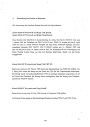 _- " . Konto 53822-05 Weyrauch undKapp TAK CBN-W 2 . . Konto 53822-04 Weyrauch und Kapp TAK Festgeld Das Konto wies am 1. Januar 1993 ein Guthabenvon DM 80.165,92 aus. TDM 80 wurden auf dem Konto 53822-04 als Festgeld angelegt und 1994 auf dieses Konto zurückübertragen. Die TDM 80 wurden an die Bundesgeschäftsstelle weiterge,leitet und unt~r den. sonstigen . . ' - Einnahmen ausgewiesen. Das restliche Guthaben von DM 4.753,71 wurde auf das Konto 56422-08 übertragen. Konto 56091-02 Weyraucb & Kapp TAK CBN 4 ·C . ( ·- . Konto 56091-01 Festgeldkonto Das Konto 56091-02 wies zum 1. Januar 1993 einen Anfangsbestand von DM 49.999,97 aus. Das Festgeldkonto hatte einen Anfangsbestand von. DM 600.000,00. Nach Gutschrift von Festgeldzinsen wurden im Juli 1993 TDM 70 auf das Festgeldkonto 56091-01 übertragen. Per 5. August 1993 erfolgte eine Rückzahlung aus dein Festgeldkonto yon TDM 670 und eine Barauszahlung in Höhe von DM 448.770,10. Dieser Betrag ging als Bareinzahlung auf das Konto 56542-07 (Abfmdung Dr. Lüthje). TDM 222 wurden zwischenzeitlich als Festgeld angelegt. Im Februar 1994 wurden TDM 170 mit dem Buchungstext "Sonstige Einnahme" auf das Konto der Bundesgeschäftsstelle bei der Commerzbank in Bonn übertragen. Der Betrag ·wurde als sonstige Einnahme verbucht. Nach der Rückübertragung von TDM 55 vom Fest- geldkonto 56091-01 wurden zwischen dem 23. und 29. Novemberper Barauszahlungjeweils ( ( dreimal Beträge in Höhe von DM 18 . 000,00 auf das Konto 24980-12 übertragen. Das Konto wurde am 1. Dezember 1994 mi_t .einer Überweisung des Restbetrages in Höhe von DM 16.984,13 aufdas Konto 24980-12 abgeschlossen. Konto 56542-07 Weyraucb·& KappTAK. Auf dieses Konto wurden am 5. August 1993 DM 448.777,1 0 bar eingezahlt. Es handelte sich hierbei offensichtlich um eine Übertragung vom Konto 56091-02. Das Geld wurde an Herrn Dr. Lüthje übertragen. Es handelt sich hierbei offensichtlich um seine Abfindung. Per 1. Oktober 1993 wurde das Konto wieder geschlossen. 15 828