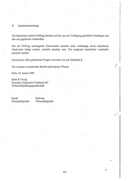 F. · Schlussbemerkung Die Ergebnisse unserer Prüfung beruhen auf den uns zur Verfugung gestellten Unterlagen und den uns gegebenen Auskünften. Die der Prüfung unterlegenen Sachverhalte konnten nicht vollständig durch schriftliche Nachweise belegt werden, sondern mussten zum Teil aufgrund mündlicher Auskünfte beurteilt werden. Hinsichtlich offen gebliebener Fragen verweisen wir auf Absclmitt E Wir erstatten vorstehenden Bericht nach bestem Wissen. ·Köln, 20. Januar 2000 Ernst & Young Deutsche Allgemeine Treuhand AG Wirtschaftsprüfungsgesellschaft 'Hundt Hallweg Wirtschaftsprüfer Wirtschaftsprüfer 21 834