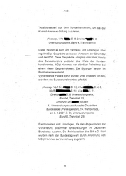 - 123- "Koalitionsakten" aus dem Bundeskanzleramt,· um sie der Konrad-Adenauer-Stiftung zuzuleiten .. (Aussage, VAe ~ S. 6, Oirekto~. 9, Untersuchungsakte, Band 4, Trennblatt 19) Dabei handelt es sich_ um Vermerke und Unterlagen über regelmäßige Gespräche zwischen Vertretern. der CDU/CSU . -~- ! und der FDP. Diese Gespräche erfolgte~ unter dem Vorsitz des Bundeskanzlers und/oder des Chefs des Bundes- kanzleramtes. MDgt Hammes war ständiger Teilnehmer bei einem dieser Gesprächskreise. Die Sitzungen fanden im- Bundeskanzleramt-statt. Vorbereitende .·.. . Papiere . dafür . wurden : . unter anderem ' . . von Mit- arbeitern . des Bundeskanzleramtes . _ .. · .. . gefertigt. . (Aussage VLR Dr. . . . S. 1_5, V A e - g 4, 5, . MinR S. 10, VAe . .S.'11, Direktor S. B, Untersuchungsakte,. _Band 4, Trennblatt 19, Anhörung Dr. • • vor dem 1. Untersuchungsausschuss des Deutschen Bundestages (Parteispenden), 14. Wahlperiode, - am 5. 4. 2001 S. 26, Untersuchungsakte, Band 5, Trennblatt 23) Fraktionsakten sind Unterlagen, die den Abgeordneten zur Vorbereitung bestimmter Entscheidungen im Deutschen Bundestag zugehen. Die Fraktionsakten des BM a.D. Bohl wurden nach der Bundestagswahl durch Anordnung von MDgt Hammes der Vernichtung zugeführt. 191