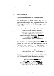 - 125- 7. Beweiswürdigung 7.1 Zuständigkeit des Beamten imBundeskanzf.eramt Die Zuständigkeit des MDgt Hammes fo!gt · aus dem Geschäftsverteilungsplan des Bundeskanzleramtes, der Einlassung des Beamten und den Bekundungen verschie- dener Zeugen. (Geschäftsverteilungsplan, Stand 8. Juni 1998, Untersuchungsakte, Band 1, Trennblatt 4, Organisationspläne des Bundeskanzleramtes von 1992 bis 1998, Untersuchungsakte, Band 1 Trennblatt 3, Aussage Mif)R • • • • S. 4, Oberst i. G. ~- 2, Untersuchungsakte, Band.4, Trennblatt 19) Insbesondere in derVerneh_mung des Direktors- haben .· sowohl der Zeuge ·als auch MDgt Hammes über die Teilnahme des Beamten an Besprechungen im Bundeskanzleramt und an Koalitionsgesprächen berichtet. (Aussage Direktor S. 4, 9, Untersuchungsakte, Band 4, Trennblatt 19) Verschiedene Ze~gen haben übereinstimmend das korrekte · und pflichtbewusste Arbeiten des Beamten geschildert. (Aussage Botschafter-S. 2, BM a.O . . . S. 11, JAI'in-S. 9, Direktor,..S. 10, 11, MinDiri.e.R.,...S. 4, Untersuchungsakte, Band 4, Trennblatt 19) 193