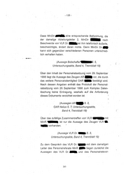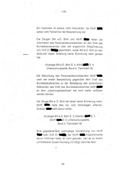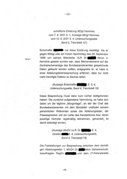 - 137- (Aussage BM a.D. . . S. 2, VLR Dr. - S . 3, 5, MinR . . S. 4, Untersuchungsakte, Band 4, Trennblatt 19) V L R - hat sich auch an den Disput zwischen dem Personalratsvorsitzenden und dem Abteilungsleiter 1 über - .,..__ den Umfang der beabsichtigten Löschung,erinnert.. (Aussage· VLR D r . - S. 5, Untersuchungsakte, Band 4, Trennblatt 19) Ergänzend hat auch MDgt Hammes in den Vernehmungen der Zeugen MinR~ und MinR~sowie später in einer schriftlichen. Stellongnahme erklärt, er habe den sichtlich aUfgebrachten Zeugen - in das Dienstzimmer des· ,Chef ~es Bundeskanzleramtes. geführt . .Dieser Umstand ist von dem gleichfalls anwesenden MinR bestätigt' worden. (Aussage MinR D r . - S. 5, ·· Direktor-S. 3, MinR- S. 10, Untersuchungsakte Band 4, Trennblatt 19, schriftliche .Erklärung MDgt Hammes vom 7. 6. 2001 S. 1, - Untersuchungsakte, Band 2, Trennblatt 12) Eine Anwesenheit von MDgt Hammes an dieser ersten Besprechung beim Chef des Bundeskanzleramtes hat lediglich Direktor- vermutet. (Aussage Direktor-S. 3, Untersuchungsakte, Band 4, Trennblatt 19) 205