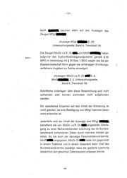 - 138- Ein Nachweis ist daraus nicht herzuleiten, da MinR . . selbst nicht Teilnehmer der Besprechung war. Die Zeugen BM a.D: Sohl und MinR - ~ :; haben die . Information des Personalratsvorsitzenden an den Chef des Bundeskanzleramtes über die .angedrohte Disziplinierung . von VLR D r . - geschildert, wobei BM a.D. Bohl an den· . .-,-.. Zeltpunkt dies.er. Mitteilung k,e!ne Erinnerung mehr gehabt · hat. (Aussage· . BM.a.D. Bohl $. . 4, MinRI/IA S. 4, Untersuchungsakte, . . .. Band 4,. Trennblatt . . . 19) . Die Be.kundung. des Personalratsvorsitzenden MinR· .. _ nach der ersten Besprechung gegenüber dem Chef des • ' '· ,·' . I ,· • ' .• ' · Bundeskanzleramtes zu der· Beteiligung .des persönlichen · Referenten· des· Chef des Bundeskanzleramtes MinR I.• • ·.- • . . :. . . I ..• an dem "Löschungsbe~ch.luss" hat ·nicht weiter verifiziert werden können. .I .Der Zeuge .BM a. D. Bohl hat .daran keine Erinnerung mehr. MinR . . hatte dies nur vöm Hörensagen e-rfahren. Direktor . .weiß davon nichts. '·· (Aussage BM a.D. Bohl S. 3, Direktor . . S. 7, MinR -.s. 4, Untersuchungsakte, Band 4J Trennblatt 19) Eine gegebenenfalls nochmalige Vernehmung von Mi~R· . . oder VLR Dr. . . . der MinR . . möglicherweise davon informiert hatte,· ist nicht geboten, weil es an einem unmittelbaren Zusammenhang mit lv1Dgt Hammes fehlt. 206