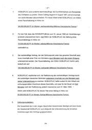 -27- 1. NOBLEPLAG wird zunächst damit beauftragt, die Durchführbarkeit und Rentabilität des Vorhabens zu prüfen. Dieser Auftrag beginnt im August 1991 und ist innerhalb von sechs Monaten abzuschließen. Für diese Arbeit erhält NOBLEPLAG von SNEA einen Pauschalbetrag in Höhe von 36.0ÖO.OOO,OO FF (in Worten: sechsunddreißig Millionen französische Francs)." 2. Für den Fall, dass das KONSORTIUM bis zum 15. Januar 1992 ein Vereinbarungs- protokoll unterzeichnen kann, sagt SNEA der NOBLEPLAG die Zahlung eines Pauschalbetrags in Höhe von 70.000.000,00 FF (in Worten: siebzig Millionen französische Francs) verbindlich zu. 3. Der rechtskräftige Vertrag, der den Schlusspunkt unter das gesamte Geschäft setzt, muss innerhalb einer Frist von höchstens neun Monaten nach der ersten Einigung unterzeichnet werden. Der Pauschalbetrag, den SNEA NOBLEPLAG hierfür zahlt, beläuft sich auf: 100.000.000.00 FF (in Worten: einhundert Millionen französische Francs). 4. NOBLEPLAG verpflichtet sich, die Ratifizierung des rechtskräftigen Vertrags durch die zuständigen deutschen Behörden spätestens innerhalb von drei Monaten nach seiner Unterzeichnung zu erwirken. NOBLEPLAG haftet zudem für den Ablauf und ordnungsgemäßen Abschluss dieses Geschäfts, und zwar für die Dauer von fünf Monaten nach der Ratifizierung, jedoch maximal bis zum 31. März 1993. - SNEA zahlt NOBLEPLAG für diesen Titel einen Betrag in Höhe von 50.000.000,00 FF (in Worten: fünfzig Millionen französische Fran'cs). 5. Zahlungsmodalitäten: Die Gesamtheit der in den obigen Abschnitten bezeichneten Beträge wird dem Konto der Gesellschaft t;JOBLEPLAC zum Zeitpunkt der Unterzeichnung der einzelnen Vereinbarungen des Vertrags gutgeschrieben. 296