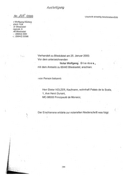 r f. Aus1er tgung .Nr. )05" 12000 Ur!?chrift einseitig beschrieben/D/8 r Wolfgang Di.erkes ;tfach 1128 • 31 Blieskastel !sgaustr. 6 .40 Blieskastel . : (06842) 3091 <.: (06842) 53596 Verhandelt zu Blieskastel am 25. Januar 2000. Vor dem unterzeichnenden Notar Wolfgang D i e r k e s , mit dem Amtssitz zu 66440 Blieskastel, erschien: -von Person bekannt- Herr Dieter HOLZER, Kaufmann, wohnhaft Palais de Ia Scala, 1, Ave Henri Dunant, MC-98000 Principaute de Monaco; Der Erschienene erklärte zur notariellen Niederschrift was folgt: '\ 299