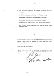 - 4 - ., 5. Dies gilt auch hinsichtlich der hierbei wiederholt genannten Personen: den früheren Kanzleramtsminister, Herrn Friedrich BOHL, d_en früheren Staatssekretär, Herrn Manfred CARSTENS, den früheren Verkehrsminister, Herrn Günter KRAUSE, den früheren CDU-Schatzmeister, Herrn Walter LEISLER-KIEP I den früheren Ministerpräsidenten von Sachsen-Anhalt, · Herrn Werner MÜNCH. c',· 111. Ich bitte vorerst um Erteilung von sieben Ausfertigungen gegenwärtiger Urkunde, davon eine zur Vorlage bei dem genannten Unter- suchungsausschuss. Kosten gehen zu meinen Lasten. \ Diese Niederschrift wurde in Gegenwart der Urkundsperson dem Erschienenen vorgelesen, vo genehmigt und eigenhändig unterschrie- ben. 303