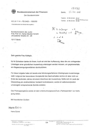l~ 0 1 52 ~ Bundesministerium der Finanzen· Berlin, Der Bundesminister Telefon: (0 30) 22 42- 35 07 oder über Vermrttlung 22 42-0 Telefax: (0 30) 22 42- 32 58 AG UA 1-14- FB 0400- 1565/00 ( Geschäftszeichen bei Antwort bitte angeben ) X rr. Lu> ~r n. ~ Bundesministerin der Justiz Frau Prof. Dr. Herta Däubler-Gmelin ~"" 'i.1::. .. Lt:u...-j ?- 1: ~ z..:. ',-1 ö Jerusalemer Straße 24 - 28 2. ;_ ";_ A. 10117 Berlin Sehr geehrte Frau Kollegin, · für Ihr Schreiben d_anke ich Ihnen. Auch wir sind der Auffassung, dass die uns vorliegenden Unterlagen einer gründlichen Auswertung unterzogen werden müssen, um gegebenenfalls . . . ein Klageerzwingungsverfahren durchzuführen. . . . Für diese Aufgabe habe ich bereits eine fahndungserfahrene Arbeitsgruppe zusammenge- stellt. Aufgrund der besonderen Komplexität des Sachverhaltes rechne ich aber nicht vor Ende des laufenden Jahres mit einem Abschluss der .Auswertung. Sollte sich im Laufe der Überprüfung ein strafrechtlicher Verdacht konkretisieren, werde ich selbstverständlich unverzüglich entsprechende Schritte einleiten. Das Prüfungsergebnis werde ich dem Untersuchungsausschuss .. Parteispenden" zur Verfü- gung stellen. Mit freundlichen Grüßen Hans Eichel ~•JS~·lnc;:llril' ~ 1C16 3~nl'l ~;bt~~·str .;q. 7S ··J\'ilheimstr g-; Ot~n<:.r-;,r;: Bann Gr:JurtH~Inrtorte-r Slr ! Q.3 H::wr.t~<:>C,ltH1e 10117 8':::'rl:n 328 ! JiJ$:'\fe>ll';(( 12 \JIL1 ~~if"r<:;fr 50 ::;:,wj,ll'·<] ·.:nrl L,-:o,<>r:H1<",CIHif! z.?.. Lerr.:lrJ~r Str:1f1 ~:- ·~ ..,. ßcnn ·~·'I t'"';n~J,..,snc-rg L:lrHJ!'' 0f,lh"!'f1'r1?1J ~S 1rn~ _:;re!d:o:>f'rmg 11 :c) 11:- ß!"'rlm