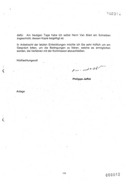 dafür. Am heutigen Tage habe ich selbst Herrn Van Miert ein Schreiben . zugeschickt, dessen Kopie beigefügt ist. ln Anbetracht der letzten Entwicklungen mö<?hte ich Sie sehr höflich um ein Ge·spräch bitten, um die Bedingungen zu klären, welche es ermöglichen würden, die Verfahren mit der Kommission abzuschließen. Hocnachtungsvoll ·. ( ---' s.-~1-4 ~ r-· Philippe Jaffre Anlage \ ( 330 000012