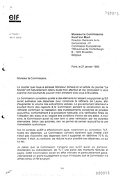 .-. -2- Les doutes de Ia Commission ont peut-etre aussi ete alimentes par le fait, avere, que SOUS le pretexte d'un pretendu "lobbying" pour Leuna, Elf a ete victime d'un detournement de fonds de 256 millians de francs, d'une part, de 13 millians de DM, d'autre part. La justice franc;;aise, saisie par Elf, enquete sur ces detournements. Ces sommes n'ont evidemment pas ete incluses dans les depenses de MIDER. C'est malheureusement Elf qui a subi Ia totalite du prejudice. Je-ne peux donc que vous confirmer que les montants indiques par MIDER cerrespendent rigoureusement aux investissements realises et qu'ils ont donne lieu a des facturations et des paiements reguliers et veritables. Elf n'a tire de ses fournisseurs aucun benefice direct ou indirect. • J'ose esperer, . Monsieur Je Commissaire, avoir ainsi contribue a dissiper les doutes de Ia Commission. Le memorandum ci-joint pourra y contribuer egalement. Je Je souhaite d'autant plus que Je retard du versement d'une subvention qui aurait normalement du inteNenir en totalite il y a plus d'un an, le caractere public des soupc;;ons con9us par Ia Commission et Ia procedure taut a fait inusitee suivie, causent a Elfun prejudice important. J'exprime enfin le desir qu'Eif puisse avoir acces a toutes les pieces dont se nourrissent les doutes de Ja Commission et dont on me dit que certaines seraient des Jettres anonymes. Je ne peux que regretter que Je rapport d'expert dont dispese Ia Commission et qui, selon les allegations de Ia presse, confirmerait les soupc;;ons de Ia Commission, n'ait jusqu'alors ete transmis ni a .J'Etat allemand ni a Elf. Je suis certain qu'un examen contradictoire Jeverait les doutes de vos seNices. Je vous. serais donc, Monsieur Je Commissaire, tres reconnaissant de me recevoir et vous prie d'agreer J'expression de ma haute consideration. Philippe Jaffre PJ. 1 332 000014