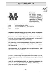 -4- Nach Aufführung der vorstehend unter Nr. 2 genannten Über-Weisungen und Schecks heißt es weiter: ·"'- ..Der Gesamtbetrag stammt im einzelnen von folgenden ursprünglichen Spendern: C + W Bauträgergesellschaft mbH 250.000,00 DM Wilhelmstraße 20, 42489 Wülfrath Herm Fred Noatnik 200.000,00 DM Schulstraße 4, 01968 Brieske Eberhard Klatt Bockumer Straße 173, 40489 Düsseldorf. 4. · Aiiaebliche Spende ~on Martin Holzschneider. Mettmann ln einem Aktenvermerk vom 21.09.00 hat der OB-Geschäftsführer die Grunde für die fehlerhafte Meldung und ihre spätere Korrektur ausfOhrlich dargelegt. l (Anlage 5) Die wesentlichen Punkte sind: · Die Fa. C + W Sauträgergesellschaft mbH & Co. KG teilt dem US am 18.02.2000 per Fax mit,• dass in den im Jahre 1999 in 6 Teilbeträgen von insgesamt 500.000 DM an d3n UB weitergeleiteten Spenden unter anderem eine ~pende in Höhe von 10.0.000 DM von Martin Holzschneider, Mettmann, enthalten gewesen sei. Dies war Grundlage fOr die Spendermeldung und die Erteilung einer Spendenbesta- -tigung gewesen. Die Mitteilung vom 20.09.2000, dass Holzschneider bestreitet .die Spende geleistet zu haben, führt zu weiteren Nachtforschungen des Unterbezirks bei der Fa. C + W Bauträgergesellschaft mbH & Co. KG. Erst daraufhin teilt diese Firma mit, dass sich der am 18.02.2000 angegebene Sachverhalt geändert hätte. Holzschneider habe zwar 1999 zugesag~. die 100.000 DM zu spenden, woraufhin C + W in Vorlage getreten sei und das Geld bereits an die SPD-Wüppert.al Ober- wiesen habe. Nachträglich sei aber Holzschneider von seiner Zusage zurückge- treten. Daher habe C + W diese Spende zusätzlich übernommen. C + W hatte allerdings versäumt, diese Korrektur dem UB anzuzeigen. 5. Presseberichterstattung Vor dem Hintergrund der COU-Finanzaffären seien in Wuppertal Gerüchte aufge- kommen, weil sich SPD und CDU im Kommunalwahlkampf eine für Wuppertaler Verhältnisse ungewöhnliche Materialschlacht geleistet hätten. Daher habe sich die SPD entschlossen, ihre Wahlkampffinanzierung der Presse zu offenbaren. Dies sei in ·einem Pressegespräch mündlich erfolgt Laut Bericht der Westdeutschen Zeitung (WZ) vom 21.02.2000 wurden die Namen der Großspender mit mehr als 20.000 Ol'vl genannt, aber ohne Betragsangabe. Neben Clees, Noatnick, Specht und Klatt wurde auch Holzschneider genannt. (Anlage 6) Auskunftsgemäß soll es von ihm keine Reaktion dazu gegeben hacan. = 1806