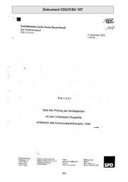 Dokument CDU/CSU 107 Sozialdemakra.ische Partei Oevtschlcnds Der Parteivorstand REVISION a_ November 2000 - HF/GJ- Bericht über die Prüfung der Großspenden an den Unterbezirk Wuppertal --- anlässlich des Kommunalwahlkampfes 1999 • Wli!y-aronc~-Hc.:nn Td<Jfon !C 3C) 2 59 91-0 ~ail: Wiihelm$IT, 141 SfG 3cni<AG 10963 Berlin Tei.,fcx {0 30) 2 59 91-4 1C ;::or~eivorsr~nd@spd.de 3er!i:t Tciagramm-Adresse: lnrer~~r. P~stt::nschr:ft: SLZ iGC 10 1 1 i So:=cd., Serlin 10911 aerlin nt!p://"""w.<pd.de Kon:o 1000 435 800 1802