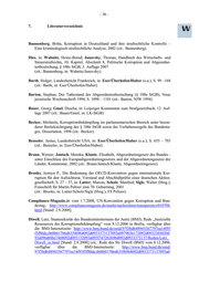 - 36 - 7. Literaturverzeichnis Bannenberg, Britta, Korruption in Deutschland und ihre strafrechtliche Kontrolle – Eine kriminologisch-strafrechtliche Analyse, 2002 (zit.: Bannenberg). Dies. in: Wabnitz, Heinz-Bernd; Janovsky, Thomas, Handbuch des Wirtschafts- und Steuerstrafrechts, 10. Kapitel, Abschnitt 8, Politische Korruption und Abgeordne- tenbestechung, § 108e StGB, 3. Auflage 2007 (zit.: Bannenberg, in: Wabnitz/Janovsky). Barth, Holger, Landesbericht Frankreich, in: Eser/Überhofen/Huber (s.u.), S. 99 –168 (zit.: Barth, in: Eser/Überhofen/Huber). Barton, Stephan, Der Tatbestand der Abgeordnetenbestechung (§ 108e StGB), Neue juristische Wochenschrift 1994, S. 1098 – 1101 (zit.: Barton, NJW 1994). Bauer, Georg; Gmel, Duscha, in: Leipziger Kommentar zum Strafgesetzbuch, 12. Auf- lage 2007 (zit.: Bauer/Gmel, in: LK-StGB). Becker, Michaela, Korruptionsbekämpfung im parlamentarischen Bereich unter beson- derer Berücksichtigung des § 108e StGB sowie der Verhaltensregeln des Bundesta- ges, Dissertation, 1998 (zit.: Becker). Benseler, Justus, Landesbericht USA, in: Eser/Überhofen/Huber (s.u.), S. 655 – 703 (zit.: Benseler, in: Eser/Überhofen/Huber). Braun, Werner; Jantsch, Monika; Klante, Elisabeth, Abgeordnetengesetz des Bundes - unter Einschluss des Europaabgeordnetengesetzes und der Abgeordnetengesetze der Länder, Kommentar, 2002 (zit.: Braun/Jantsch/Klante, Abgeordnetengesetz). Brooks, Jermyn P., Die Bedeutung der OECD-Konvention gegen internationale Kor- ruption für den Aufsichtsrat, Vorstand und Abschlußprüfer einer deutschen Aktien- gesellschaft, S. 27 – 37, in: Lutter, Marcus; Scholz, Manfred; Sigle, Walter (Hrsg.), Festschrift für Martin Peltzer zum 70. Geburtstag, 2001 (zit.: Brooks, in: Lutter/Scholz/Sigle (Hrsg.), FS Peltzer). Compliance-Magazin.de vom 1.7.2008, UN-Konvention gegen Korruption und Bun- destag, http://www.compliancemagazin.de/markt/nachrichten/transparency010708. html [Stand: 2.9.2008]. Diwell, Lutz, Staatssekretär des Bundesministeriums der Justiz (BMJ), Rede „Justizielle Ressourcen der Korruptionsbekämpfung“ vom 8.12.2006 in Berlin, verfügbar über die BMJ-Internetseite: http://www.bmj.bund.de/enid/97f3bdb48943567797ea14f95 f5f80de,068b01706d635f6964092d0933373137093a0979656172092d09323030360 93a096d6f6e7468092d093132093a095f7472636964092d0933373137/Reden/Lutz_ Diwell_ze.html [Stand: 2.9.2008] (zit.: Rede des Sts Diwell (BMJ) vom 8.12.2006, verfügbar über die BMJ-Internetseite: http://www.bmj.bund.de/enid/ 97f3bdb48943567797ea14f95f5f80de,068b01706d635f6964092d0933373137093a0